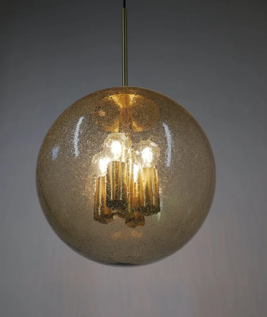 A large, brownish-tinted glass globe with air pockets houses four light sources with E27 lamp sockets. The sockets, the cover, and the pendulum rod, which houses the black cable, are made of brass.