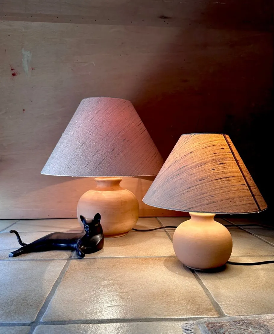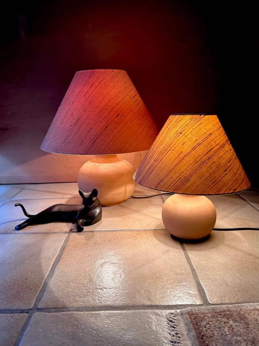 Both lamps feature pure and handcrafted vase-shaped bases in warm tones and beautiful Mediterranean style. Each brass metal socket holder carries a quality fabric shade made from wild silk.