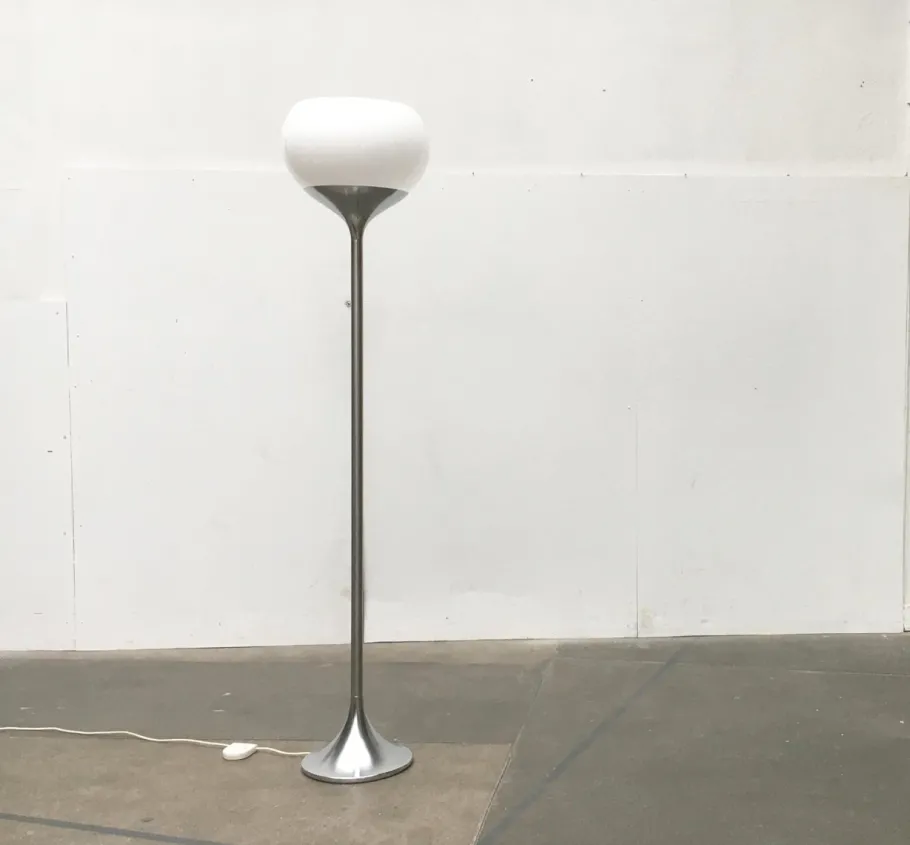 The classic Guzzini plastic shade is turned in this design. The shade is finished in translucent white. The base consists of a stem that is tulip shaped on both sides. At the bottom, to form the foot. Above, to receive the shade flush.