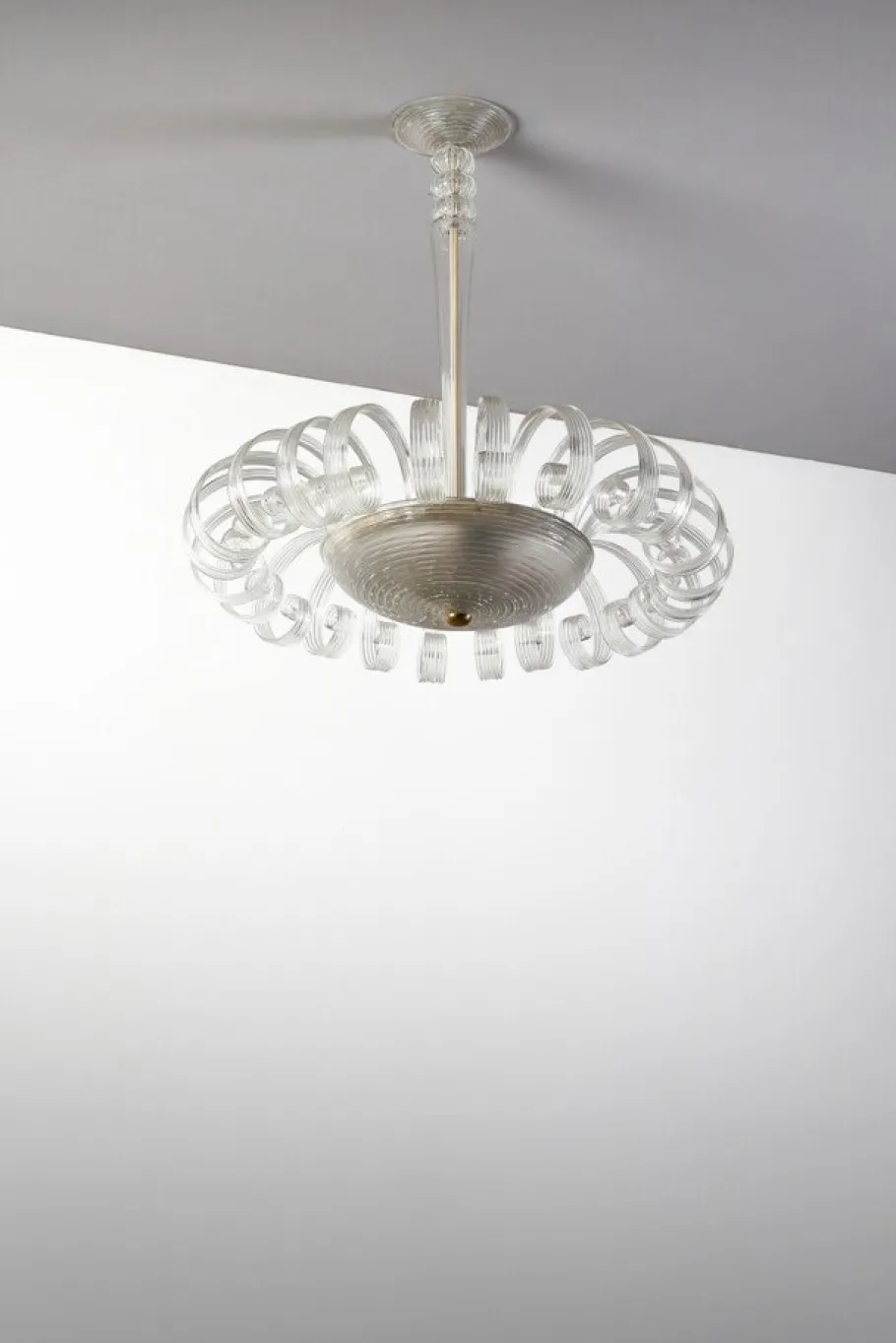 Technique: Clear, ribbed glass with bubble-embellished bowl, brass and wood frame.