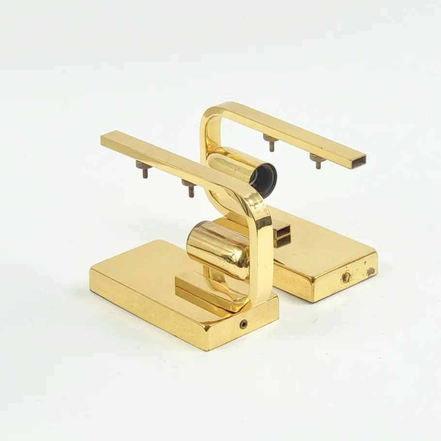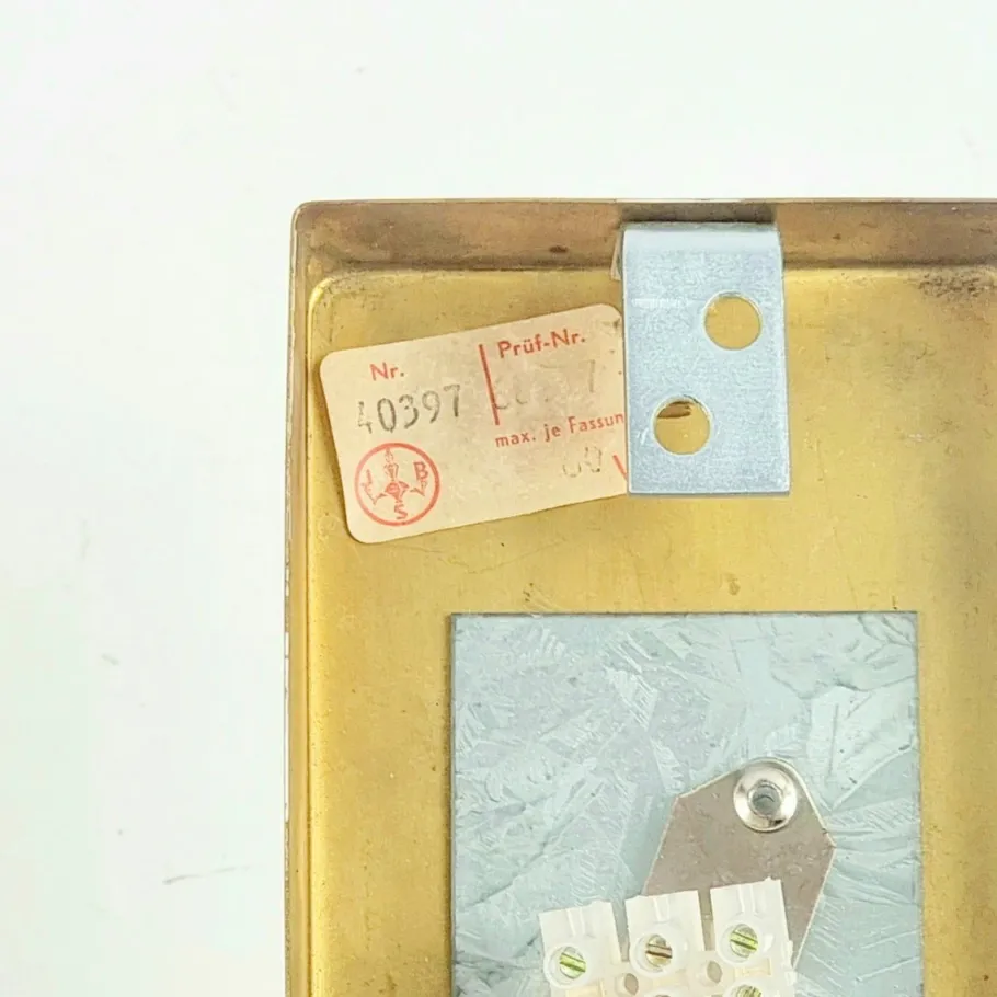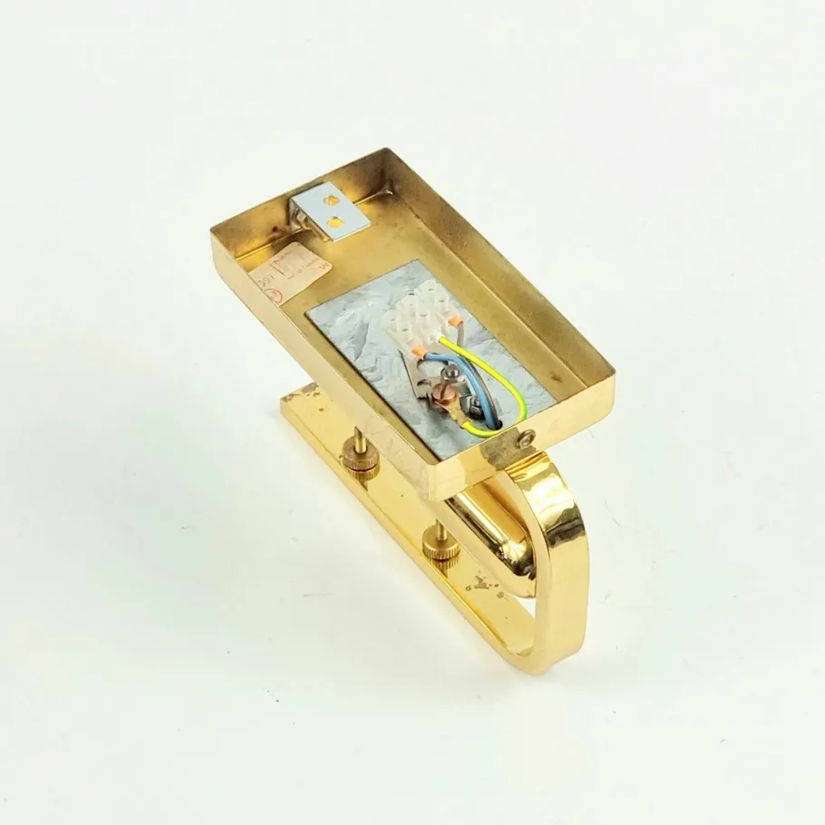 Cleaned, rewired (hardwired) and ready to use (compatible in all countries Europe, UK, US, etc.). Each wall light requires 1x E14 light bulb (E12 in the US). LED compatible. Height: 23 cm/9”; width: 13 cm/5.1”; depth (from wall): 13 cm/5.1”. Very good vintage condition. Light patina and wear consistent with age and use on the brass elements.