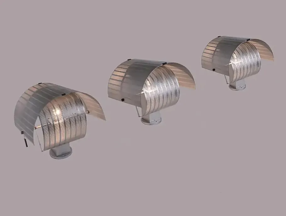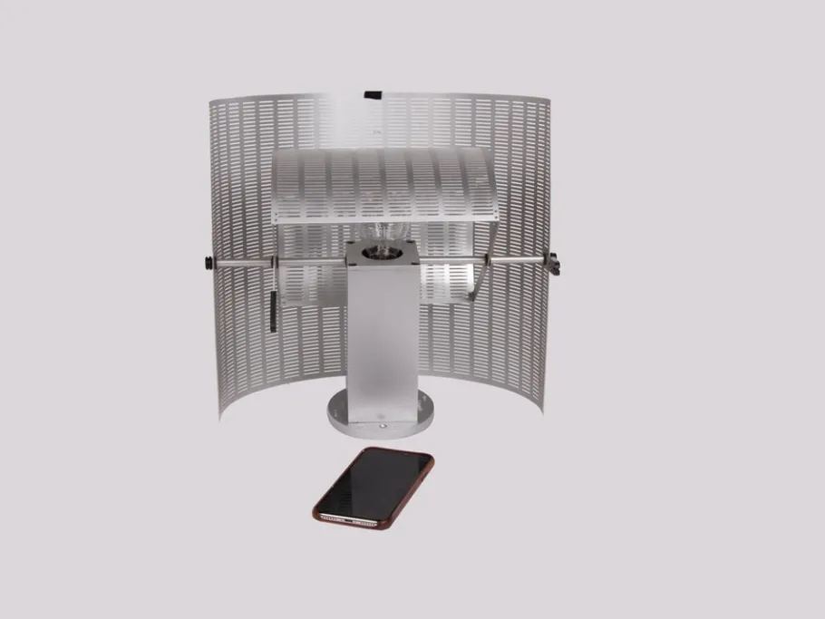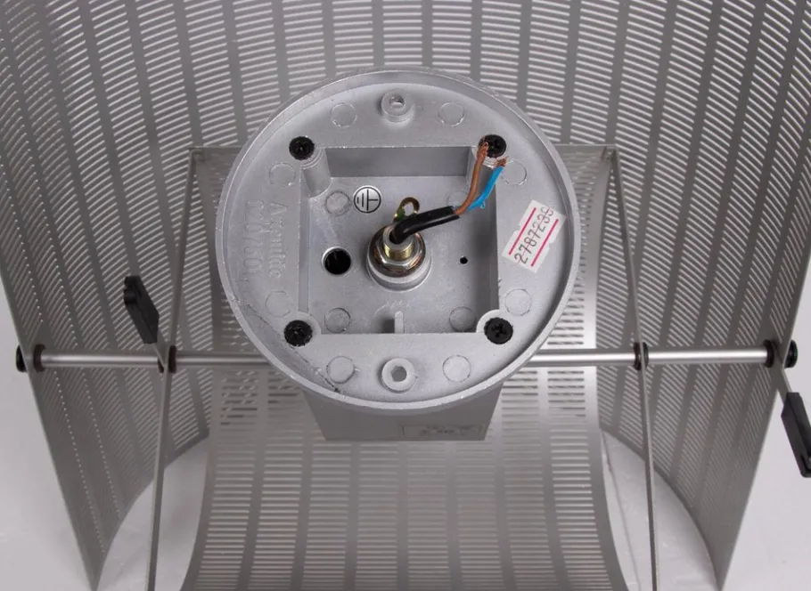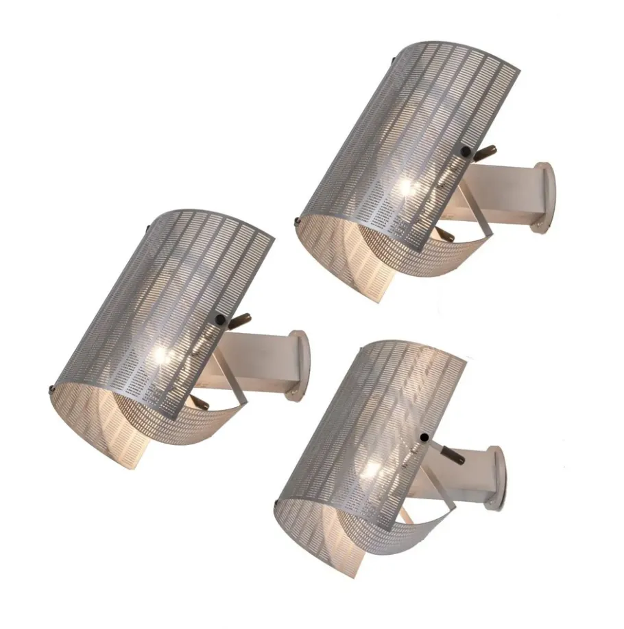The design of the lamp is based upon the form of a samurai’s visor. The two perforated silver enameled steel sheet shades are adjustable, which creates a great light / shadow effect.