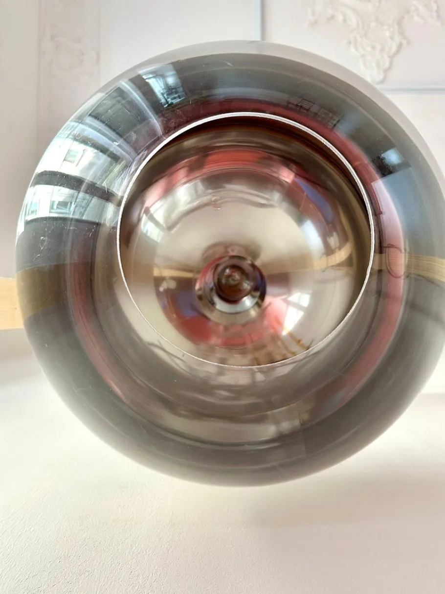 The chromed finish reflects the futuristic aesthetics of the era, echoing the work of designers like Herda, Dijkstra, Massive, or Vitrika. Suspended from a central cable, the globe floats visually in space, creating a sculptural presence both lit and unlit.