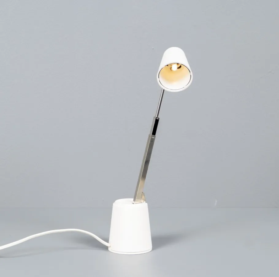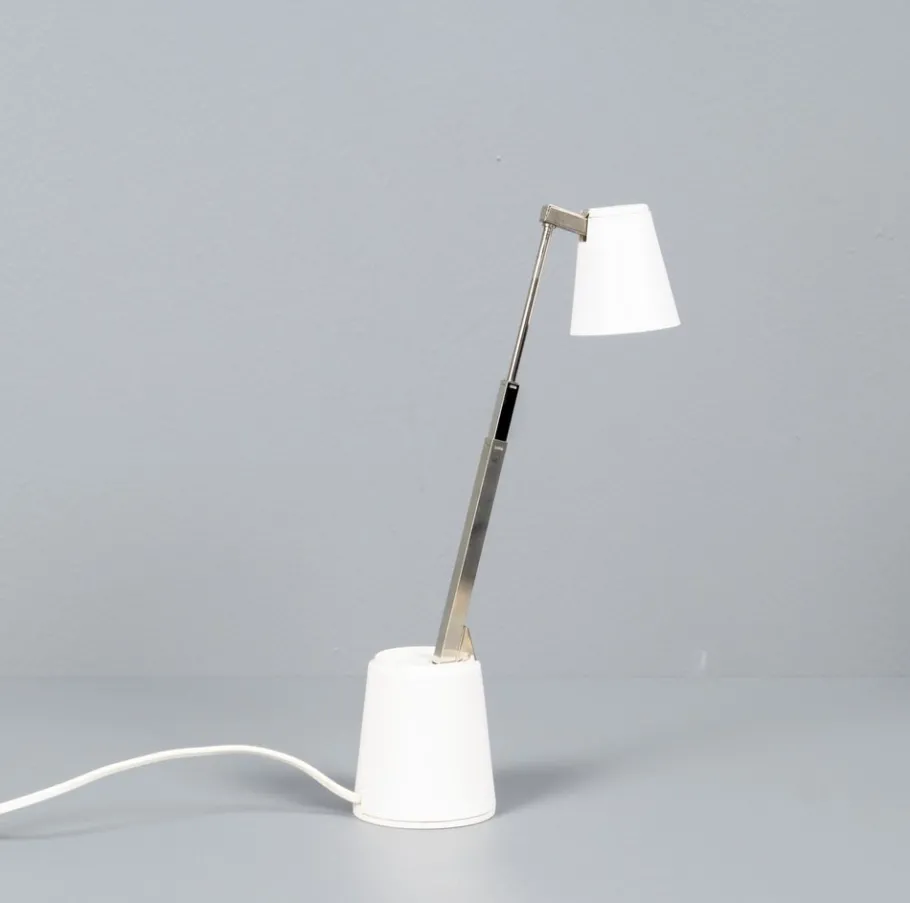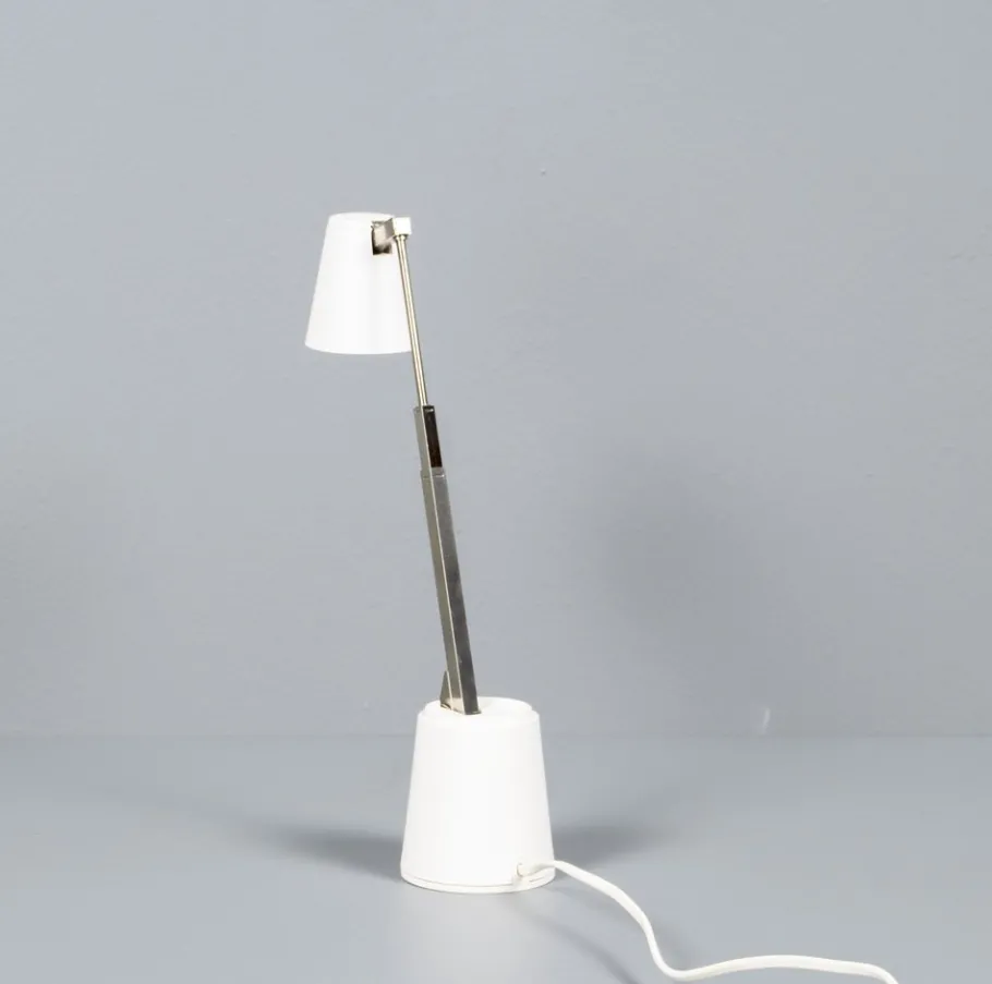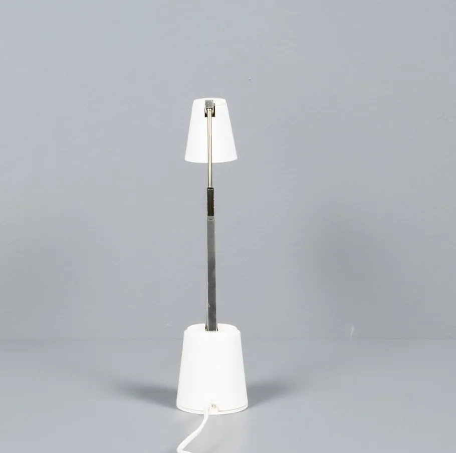 A small piece of German design history by Eichhoff Teleskop Reiselampe Lampette. The head can be rotated and tilted. If necessary, it can be folded up very compactly and taken with you.