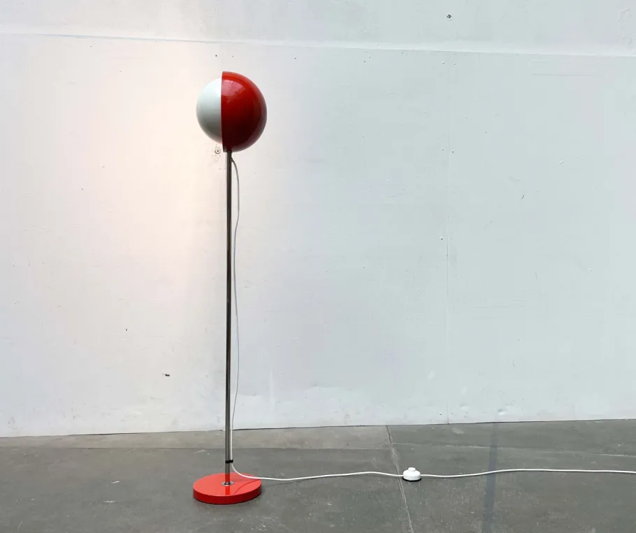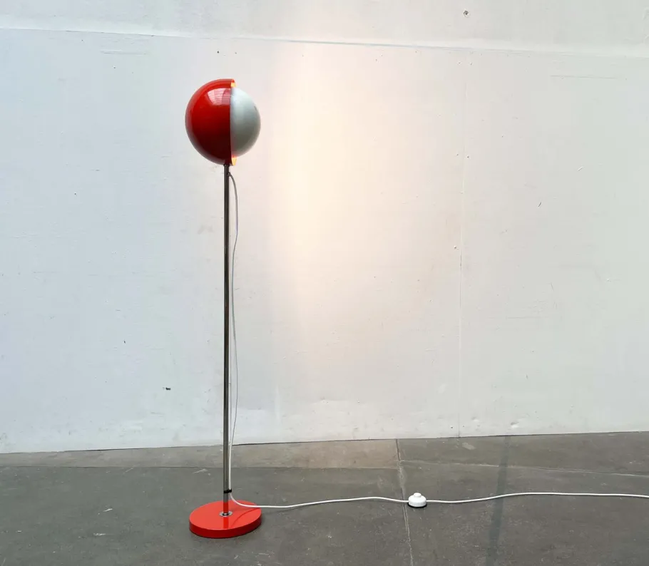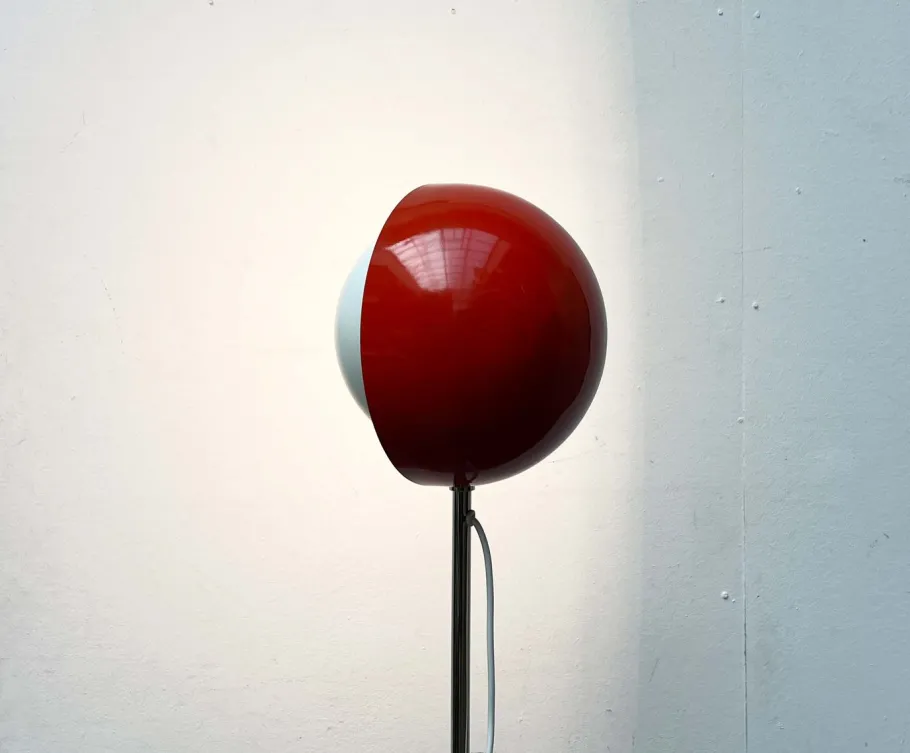 The spherical reflector sits at the top of a long shaft. It consists of two half-shells, one fixed and one adjustable. The inner shell is white and supports the lamp socket in the center. The outer shell is red and can rotate around the inner shell. It serves as a flexible shade for manually controlling the light output. This creates an eclipse effect similar to a solar eclipse. The slender chrome shaft ends in a simple, disc-shaped base. The red color of the lamp head is repeated in the base.