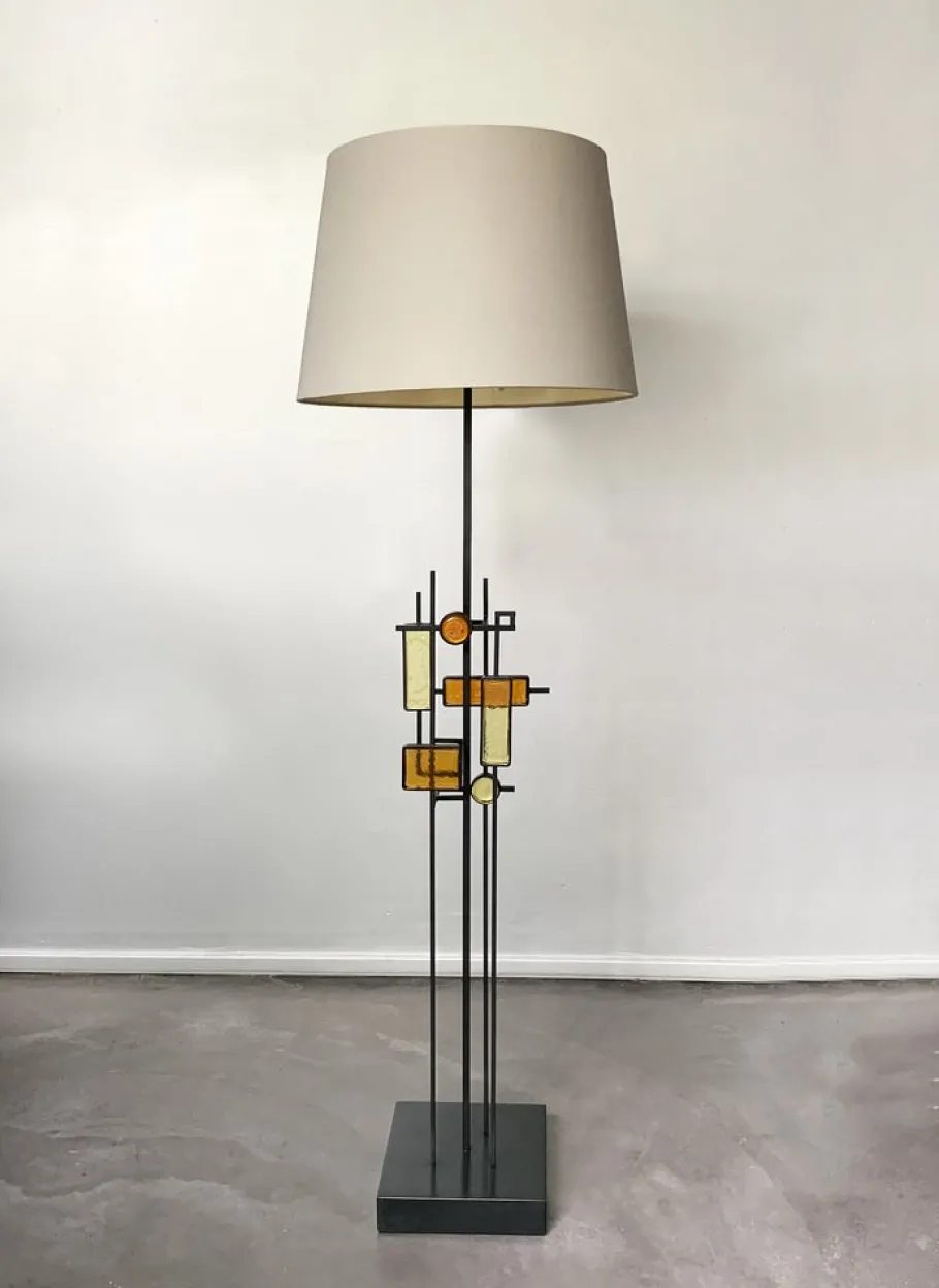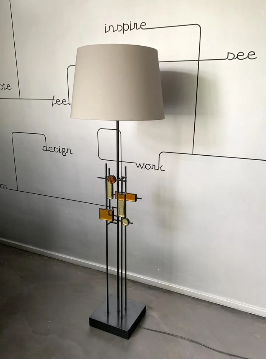 An iron structure made up of horizontal and vertical lines forms a variety of geometric shapes. These shapes create square and rectangular frames, some of them filled with elements of colored glass in shades of yellow and ochre. Base made of painted pinewood.