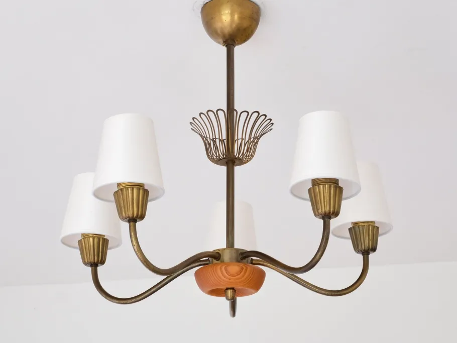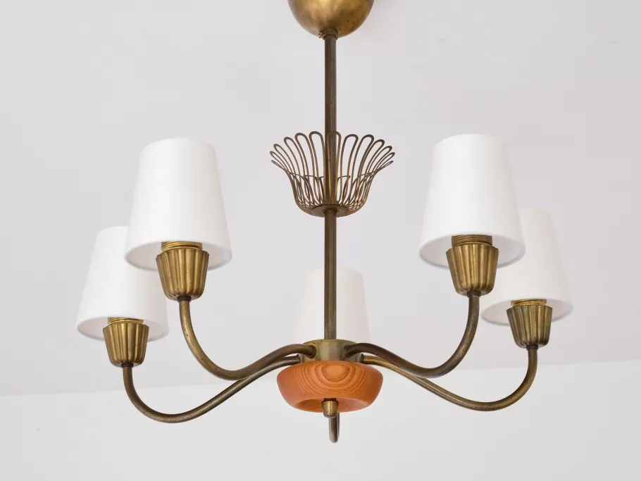 The fixture has five gently curved brass arms, each ending in a fluted brass shade holder. A turned oak accent decorates the base of the stem, while an intricately crafted wire crown detail adds character to the central column. A dome-shaped brass canopy completes the design. Each arm is fitted with a clip-on shade in pure ivory silk fabric.