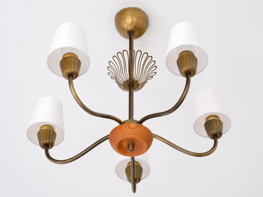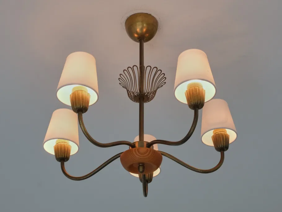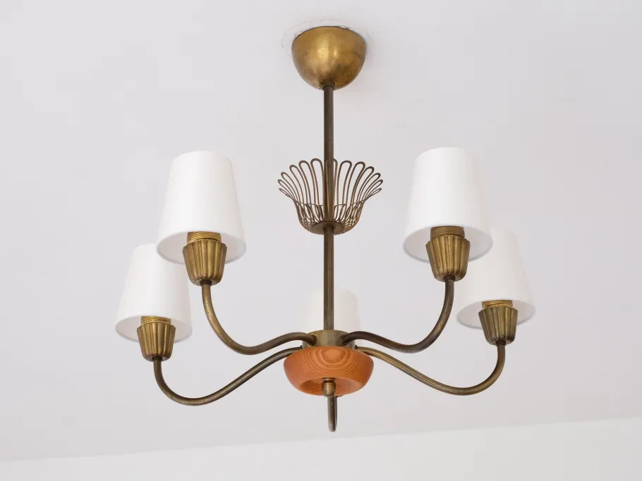 The chandelier remains in very good original condition, with the brass displaying a natural, even patina. The silk shades have been renewed. Fitted with five standard E26/E27 bulb sockets.