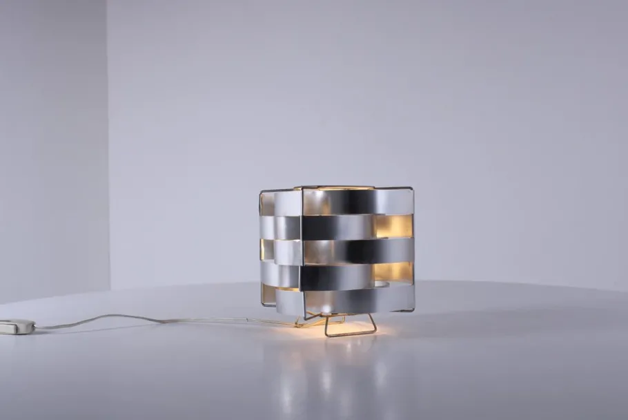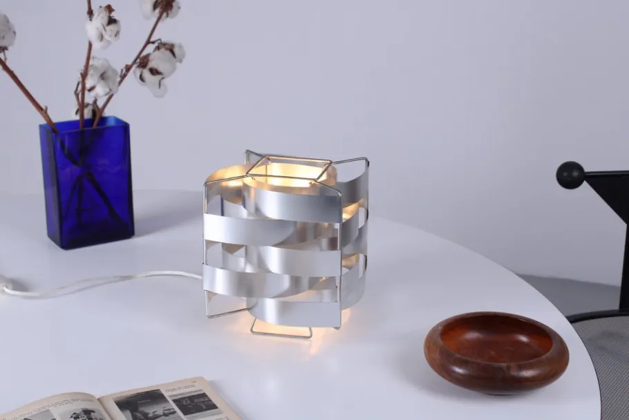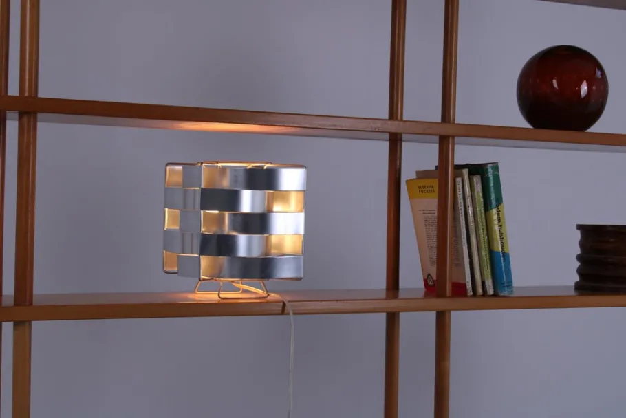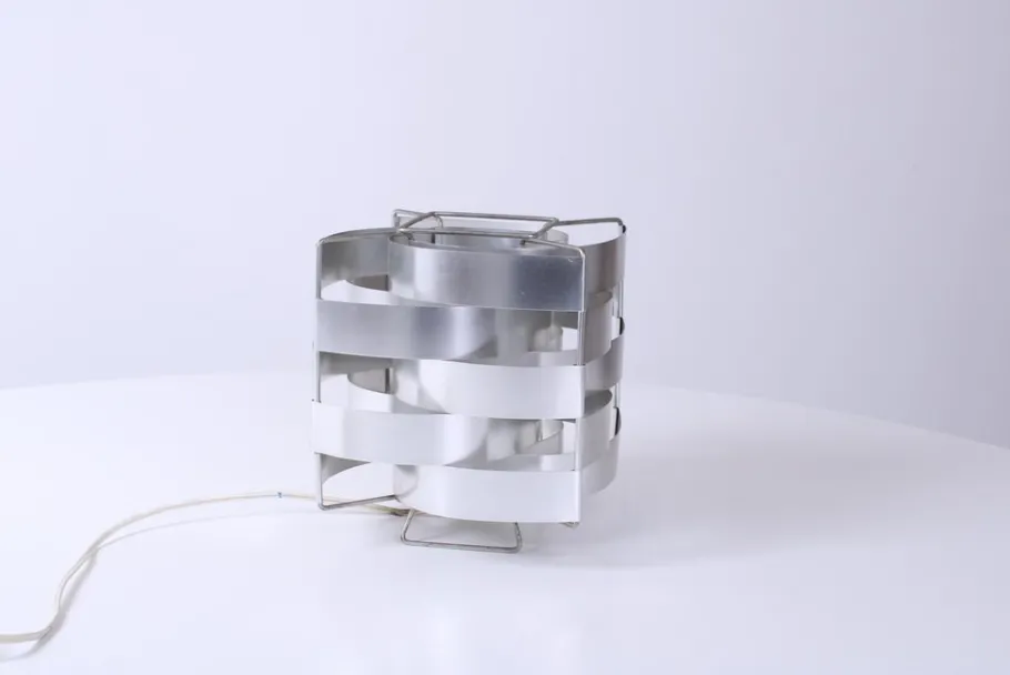 This table lamp is in very good vintage condition, the aluminium strips hardly have any damage or usermarks! Original switch and cable, all tested and working. Lightsource: one normal E27 bulbholder, suitable for modern common LED bulbs.