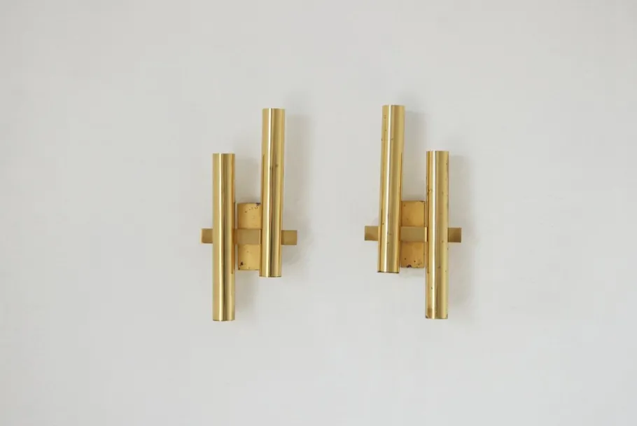 Minimalist wall lamp with solid brass construction. The lamp features two points of light. Made with the utmost attention to detail. Tube-shaped lampshades expose the light in an original way.