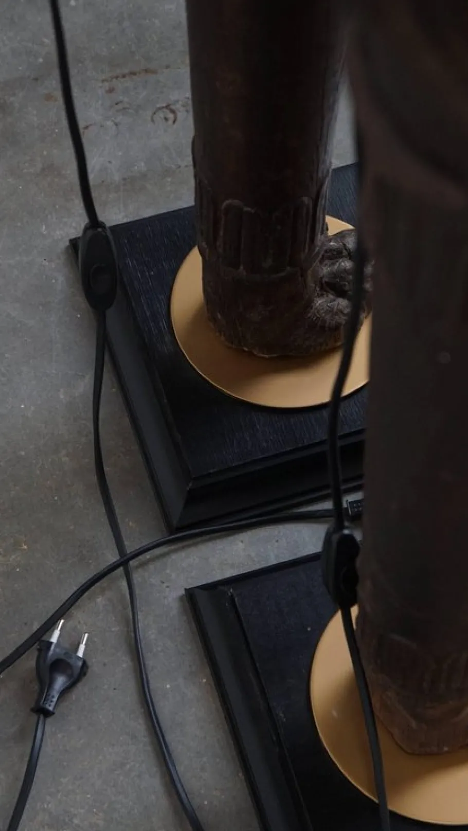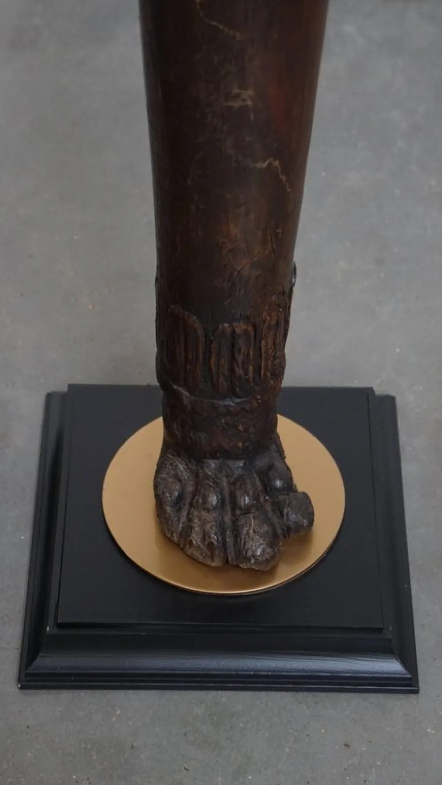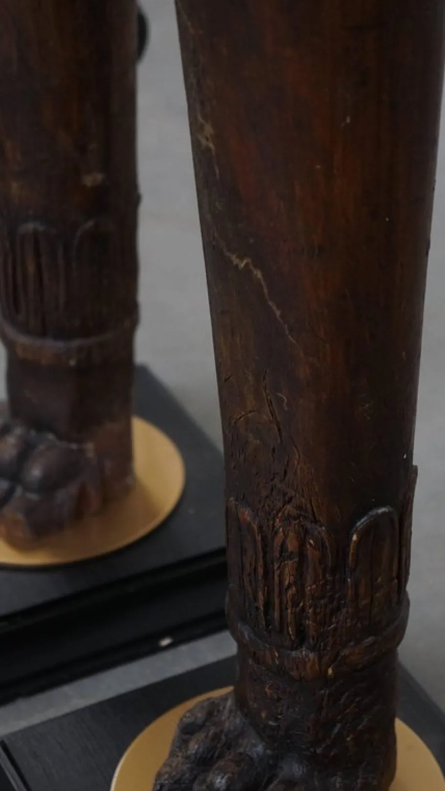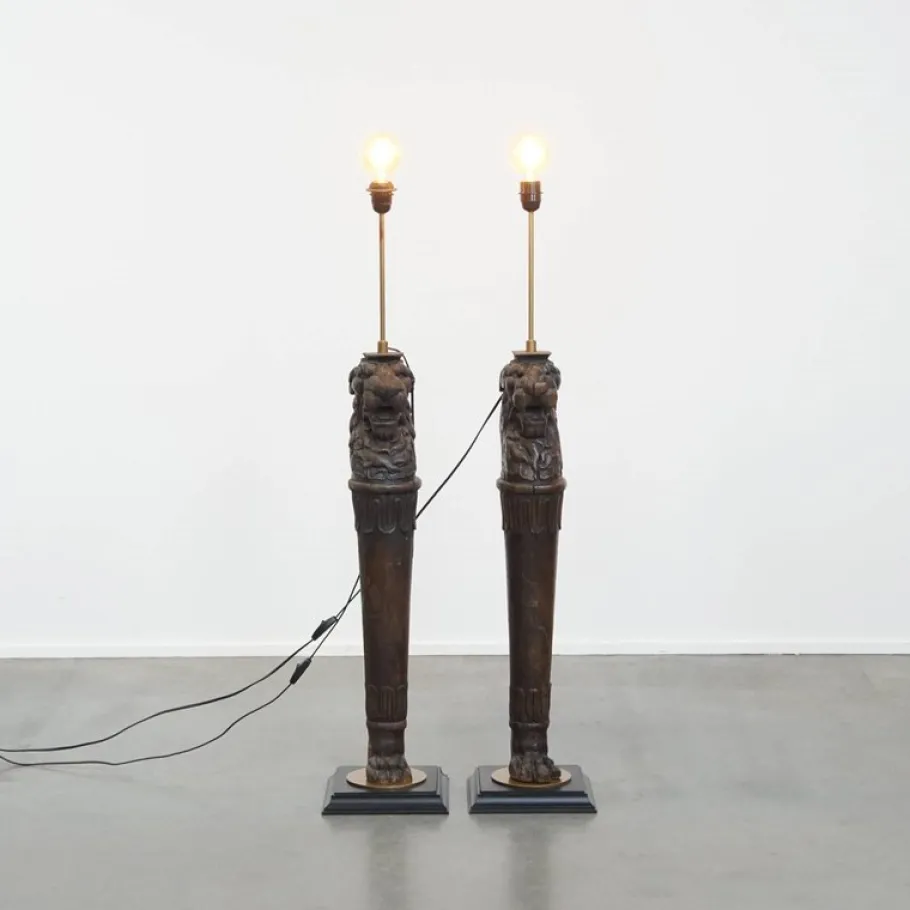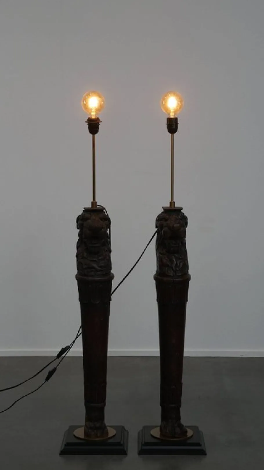This unique antique set of 2 wooden standing lamps is a wonderful addition to both classic and modern interiors. The base of these eye catchers comes from the 19th century, later they were converted into lamps. The light source is not included so you can personalize them with a beautiful lampshade, for example. They feature beautiful carvings with lion heads making each lamp a powerful yet subtle statement. Over the years they have sustained signs of use. Structurally, they are in good, immediately usable condition. Where will you place these eye-catchers?