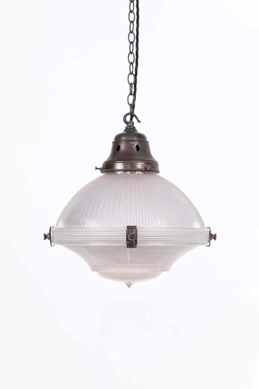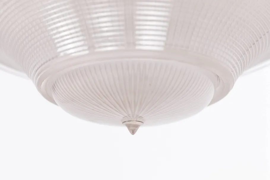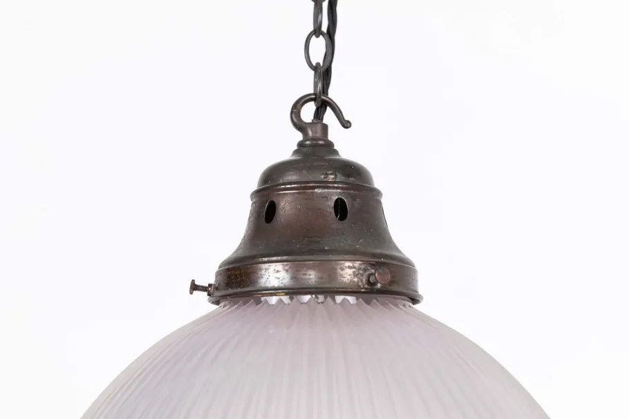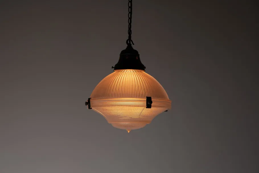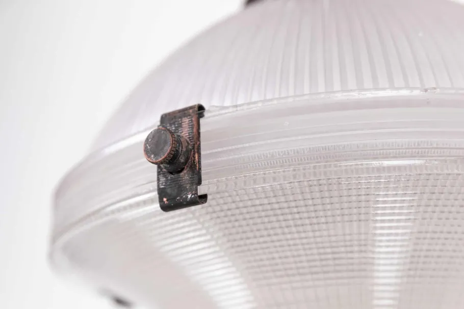 Holophane was founded in 1896 by businessman Otis Mygatt who set up companies in both America and the UK for the production and sale of their ingeniously designed prismatic lenses and reflectors. Holophane lights are used all over the world in a multitude of different environments, each serving a different purpose – whether it be a library, a train station or a chemical plant. The word Holophane derives itself from the Greek words ‘Holos’ and ‘Phainein’ meaning ‘to appear completely luminous’. Later on in it’s production Holophane secured the largest-ever single lighting order in the UK of 65,000 fittings, covering 186 miles of tunnels in the London Underground. Holophane has provided some 80 years of service to the London Underground in total.