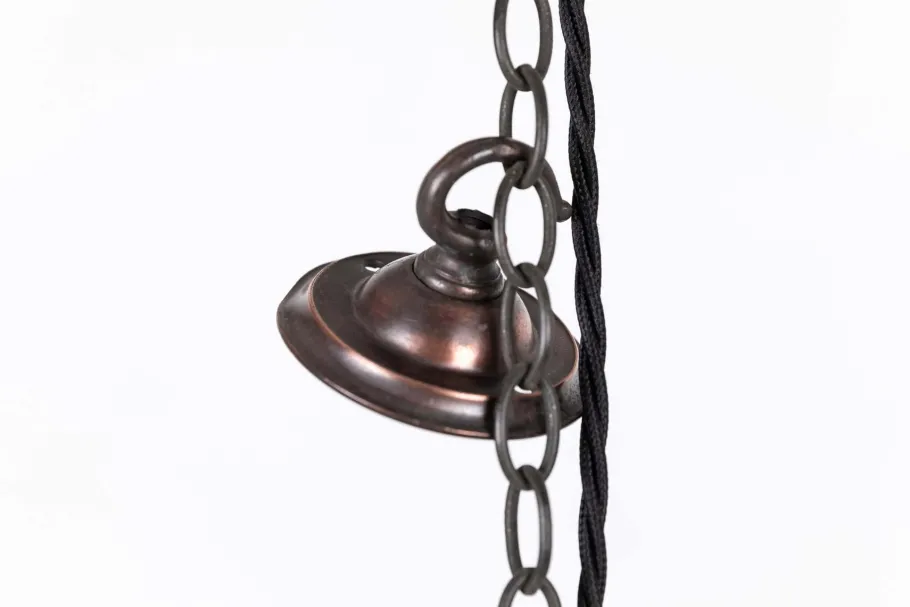 Three-part prismatic glass reflector, including the bottom cup, supported by original copper gallery. All glass parts stamped Holophane.