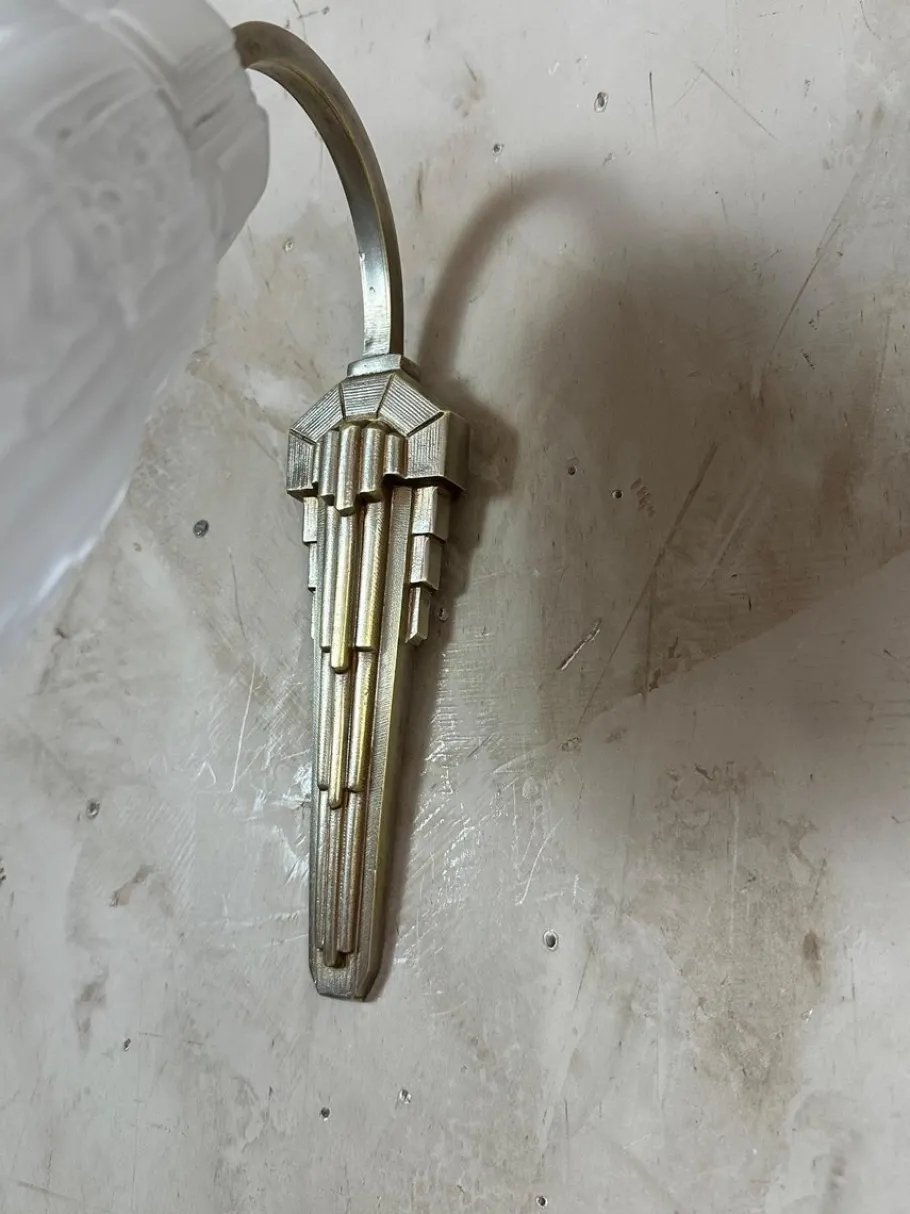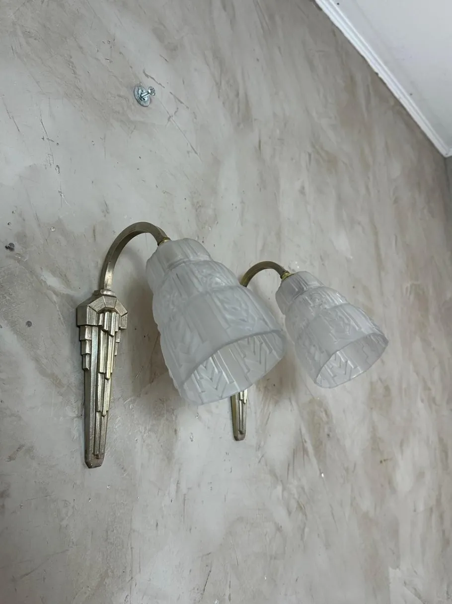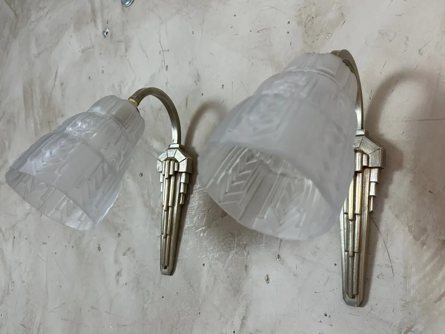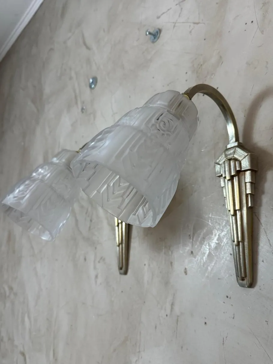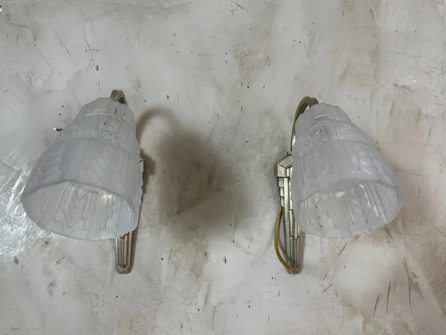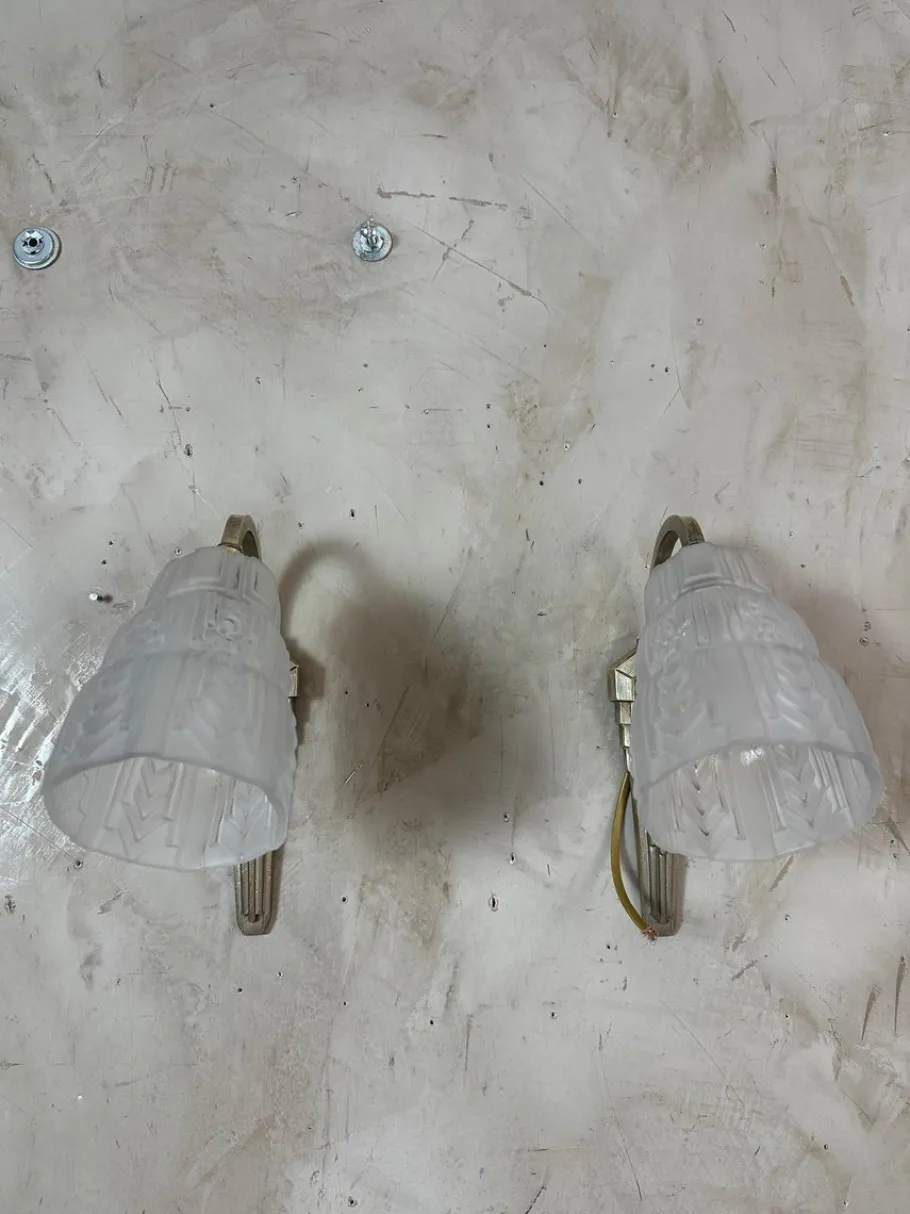 Each sconce features a frosted glass shade engraved with geometric patterns, diffusing a soft, warm light while enhancing the overall effect.