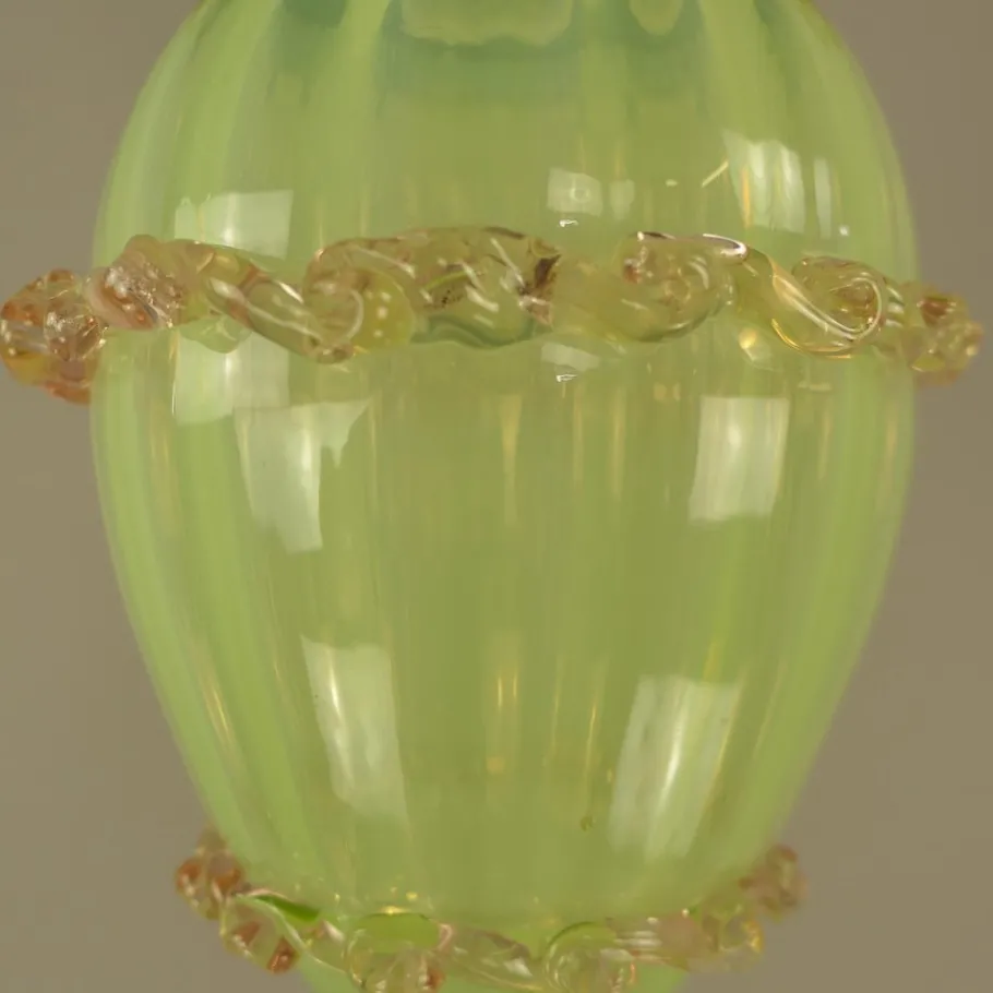 The two-coloured, hand-blown glass body is made of thick uranium glass.
