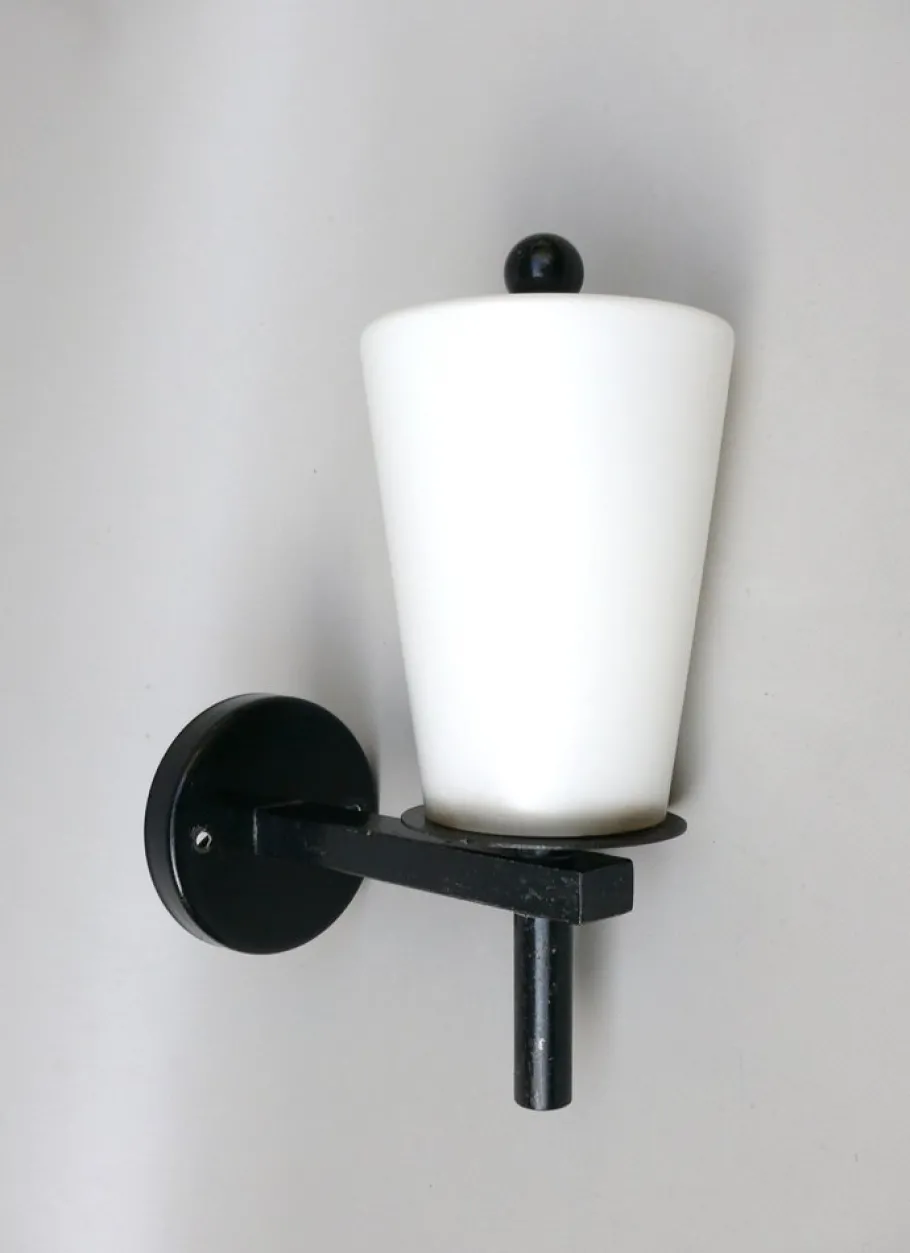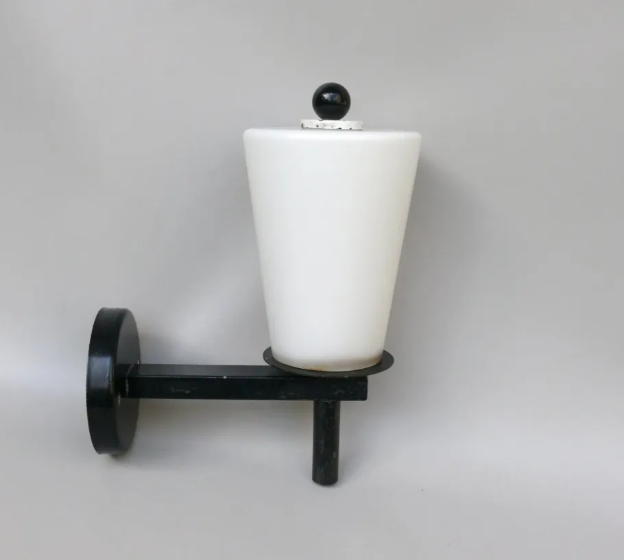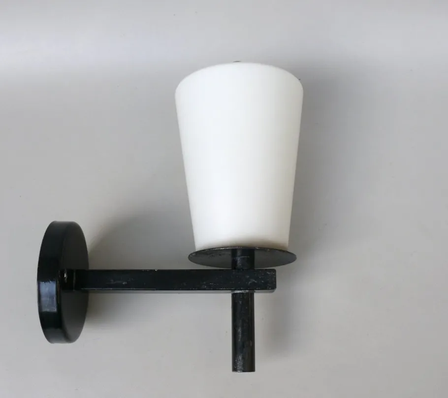 The funnel-shaped lampshade is made of white overlaid glass, the wall bracket is made of painted metal.