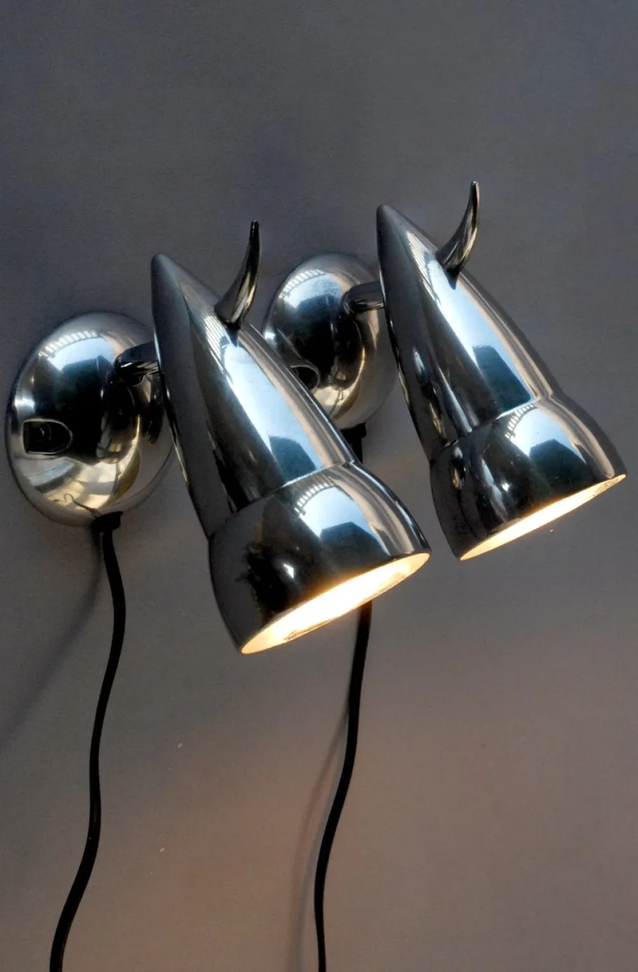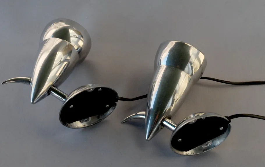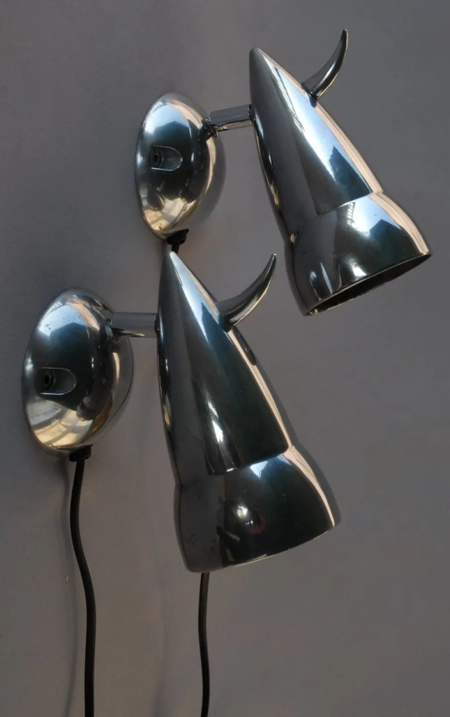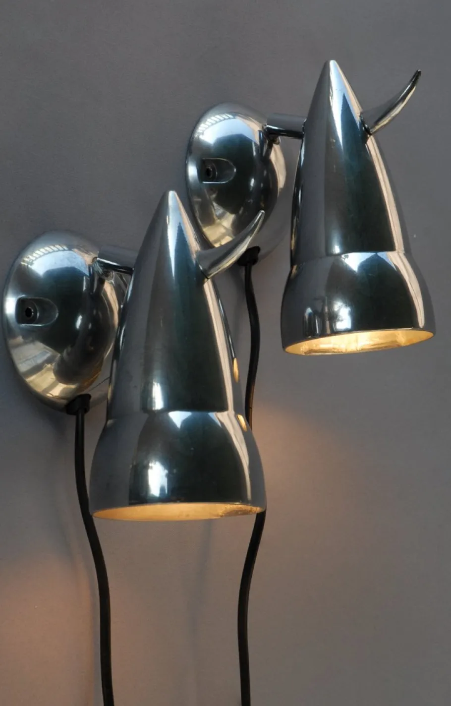 The lamp shade is a cone, the base is slightly spherical with a distinctive ‘Horned’ handle detail to manoeuvre the light source. The lamps are made of nickel-plated metal.