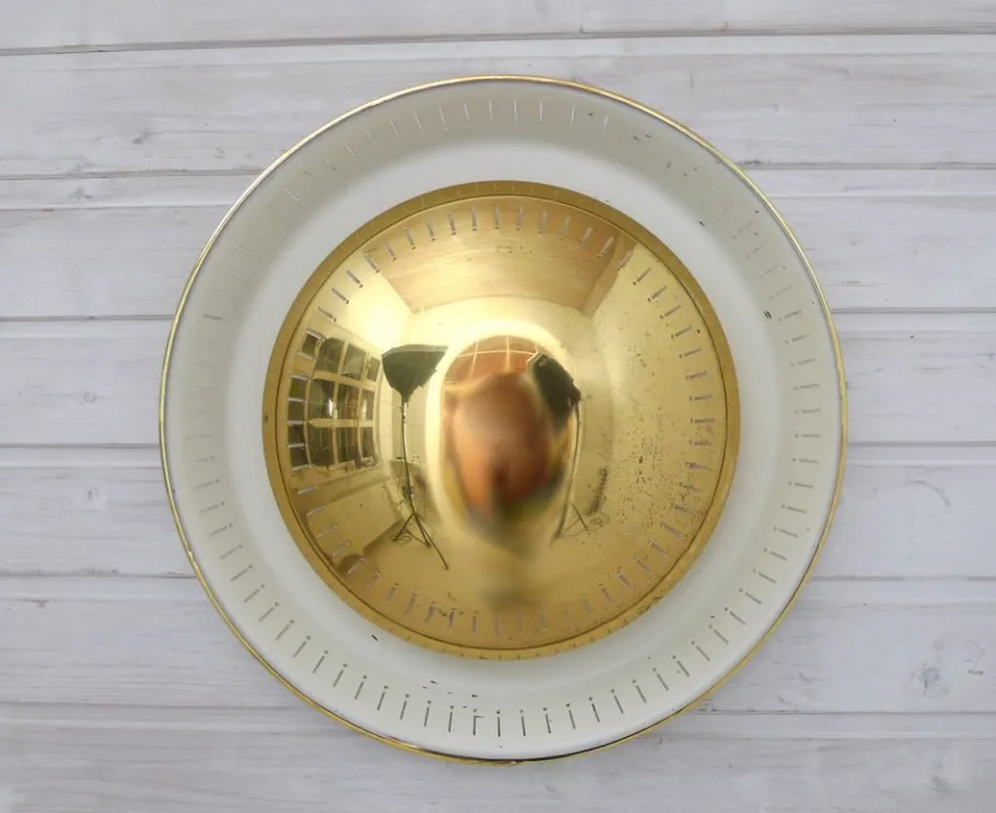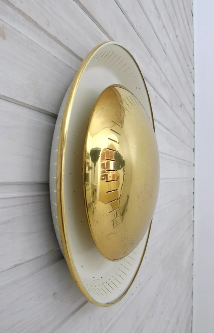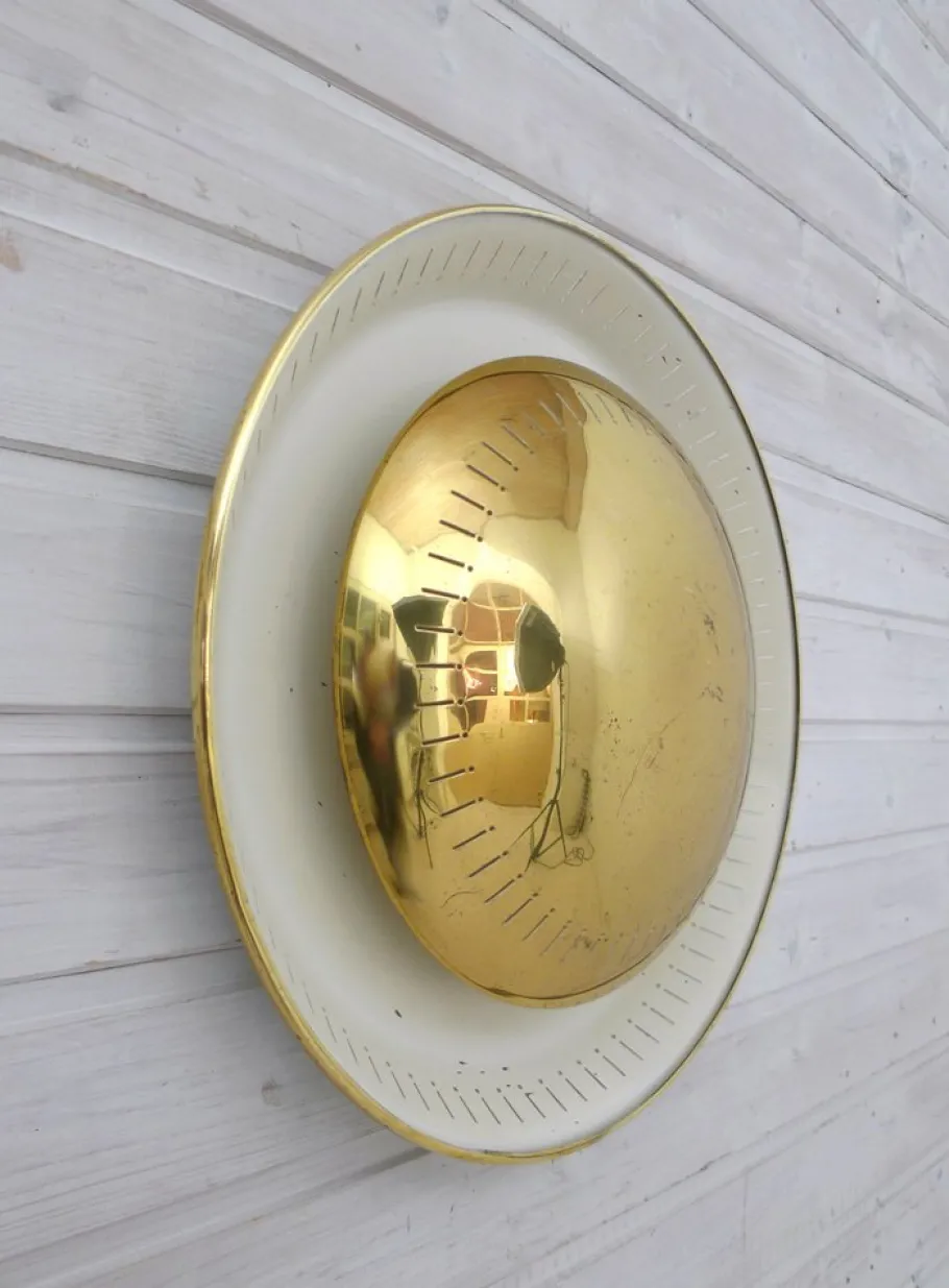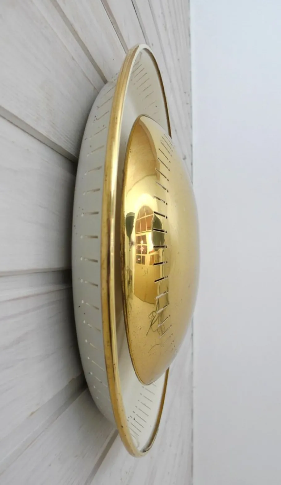 The combination of white -painted metal plate for wall mounting and overshairing perforated brass dome creates a warm and atmospheric light effect. Inside the lamp there are two E 27 light bulbs. The electrical cables were renewed.