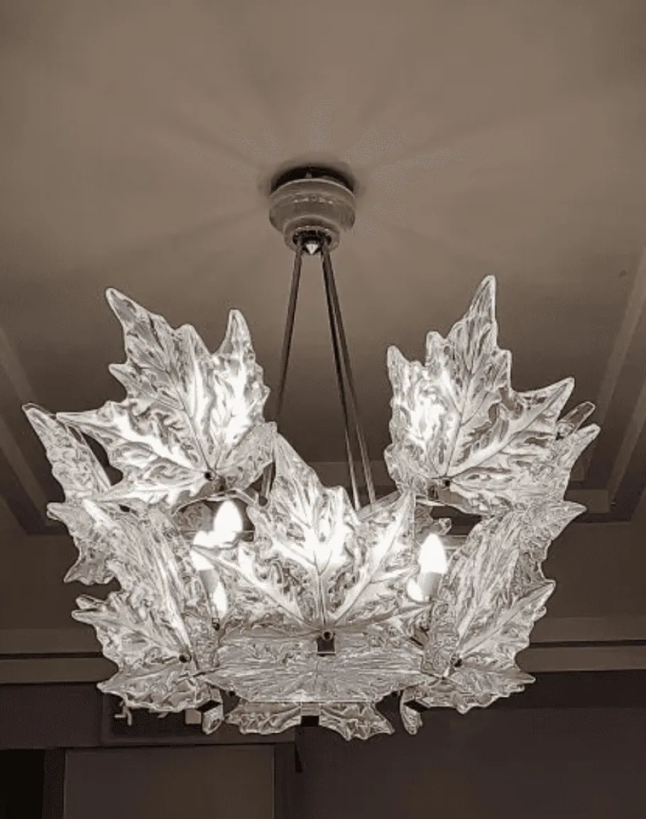 The two-row pendant light is made of molded, pressed, satin, matte and shiny crystal plane tree leaves, metal frame.