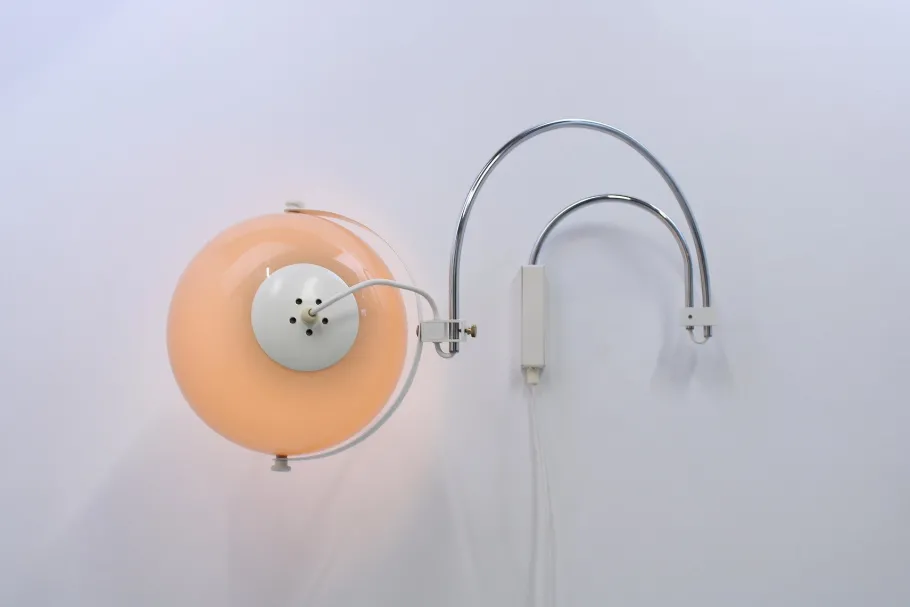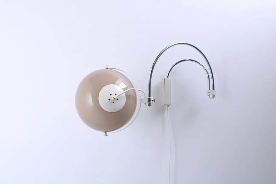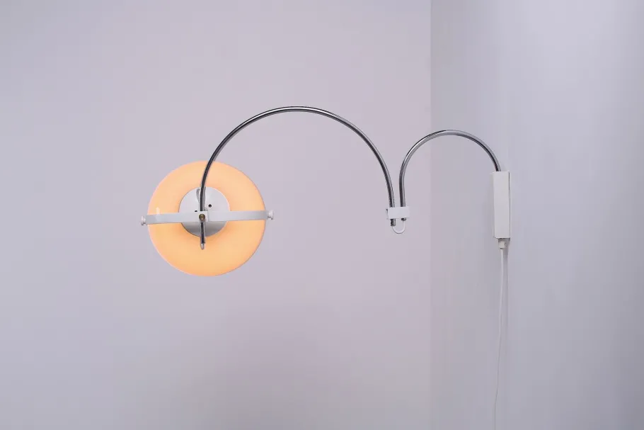 Thanks to its adjustable construction, the lamp functions both as ambient lighting and as a directional spotlight, casting subtle, warm illumination on the wall or surrounding space.