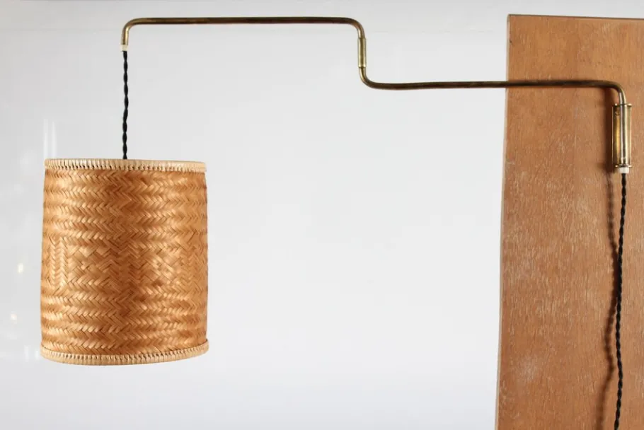 The wall light has a swing arm frame of brass with patina mounted with shade made of plaited cane. The cane shade spreads a cozy warm light.