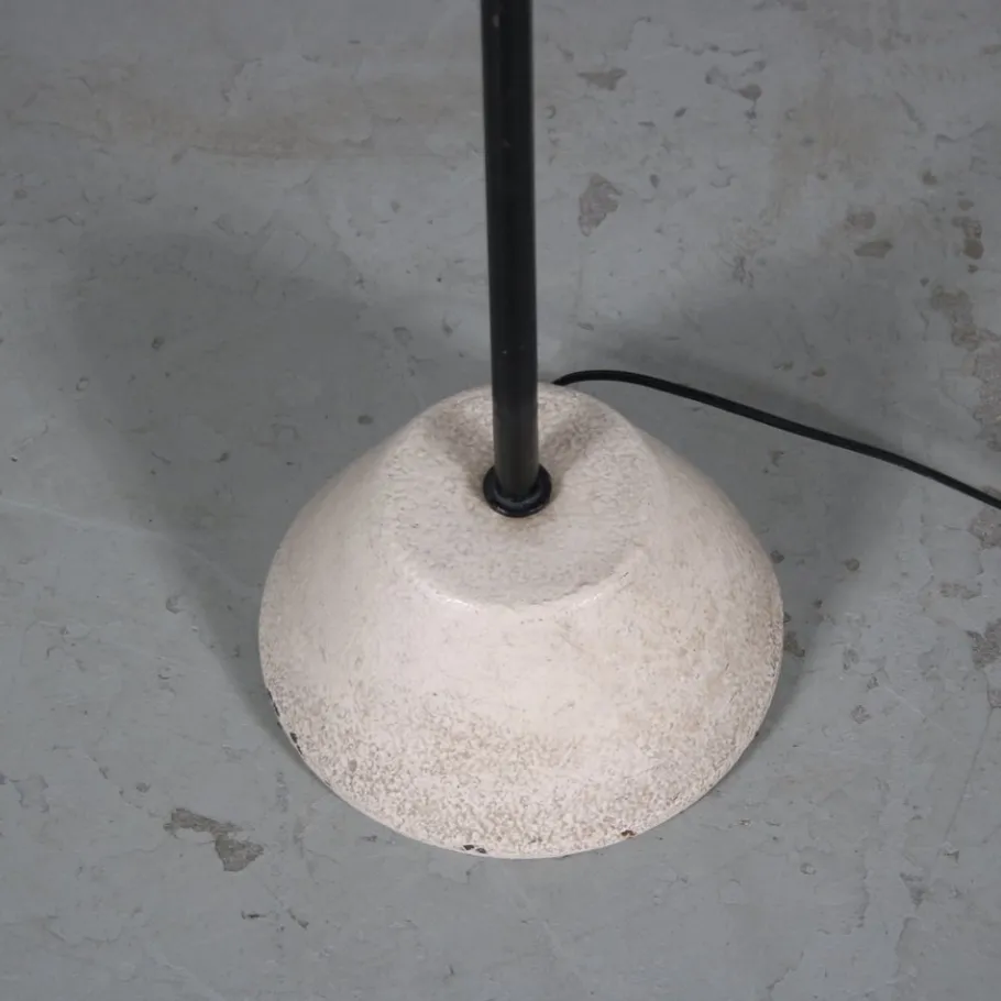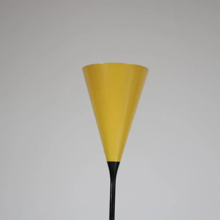 This elegant, minimalist piece has a wonderful appeal that nicely combines colours, materials and shapes. It’s a highly recognizable find that is guaranteed to draw the attention of any design enthusiast! The yellow metal hood adds a pop of color and personality, nicely contrasting to the black lacquered metal arm. The foot is made of cream / white coloured stone, which nicely balances the piece and works really well with the other materials, allowing each element of the piece to truly stand out! The on/off switch is located on the shade for ease of use. When lit, it emits a bright upwards light.
