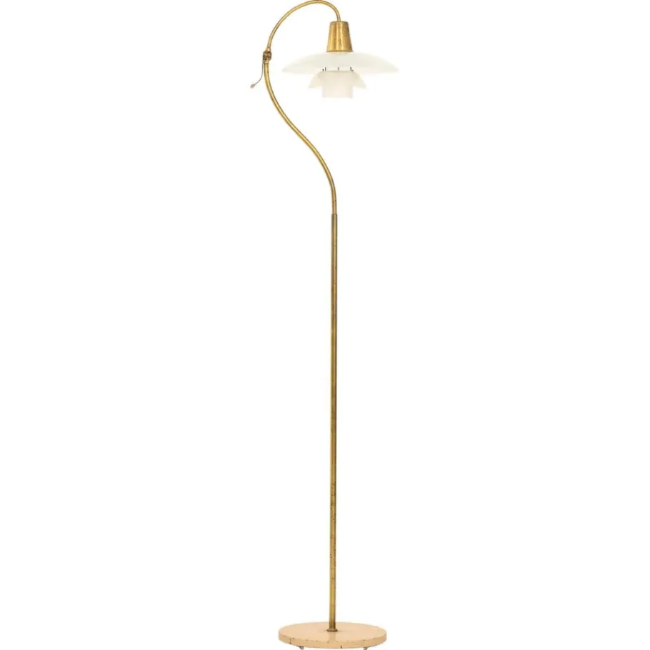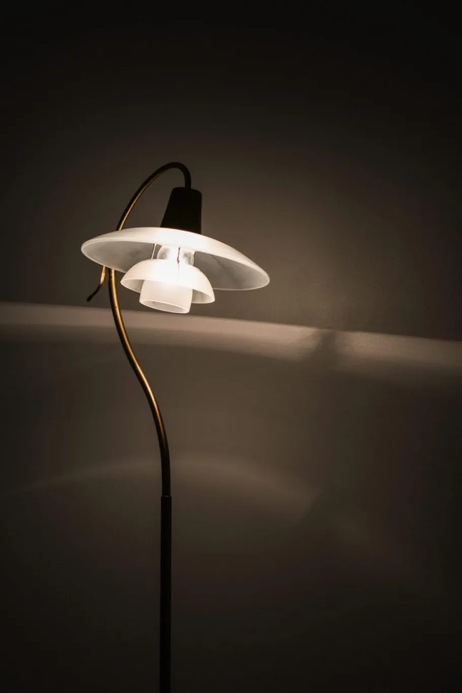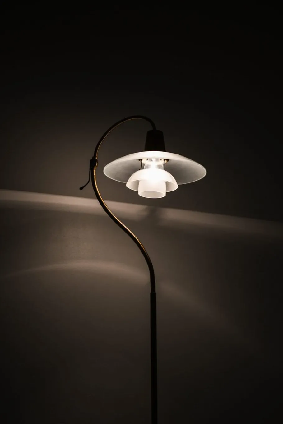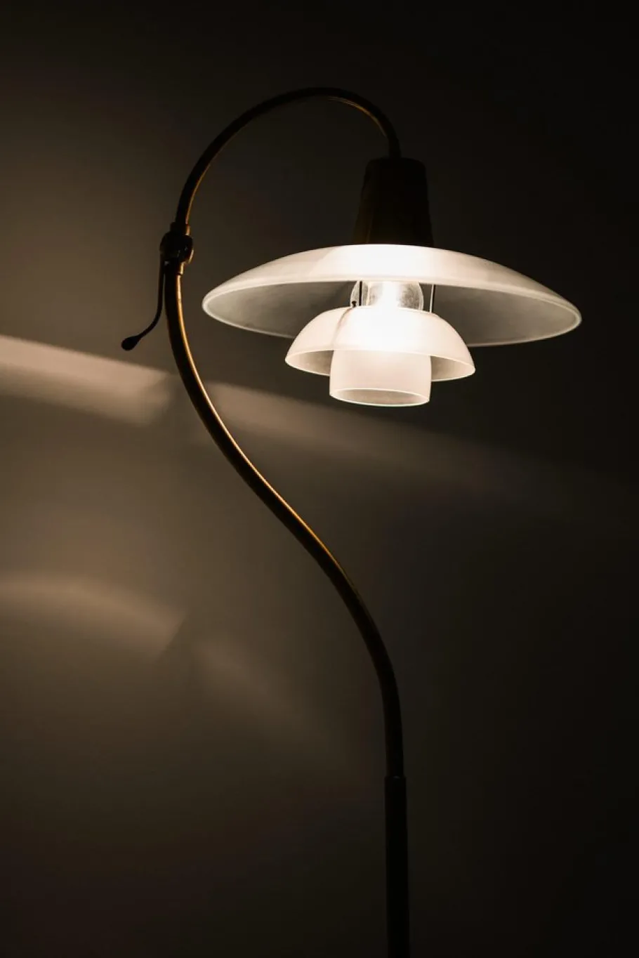 Material: Bronze patinated brass and original glass shades Style: Mid century, Scandinavian Very rare floor lamp model ‘The question mark’ Produced by Louis Poulsen in Denmark Dimensions (W x D x H): 28 x 37 x 154 cm Condition: