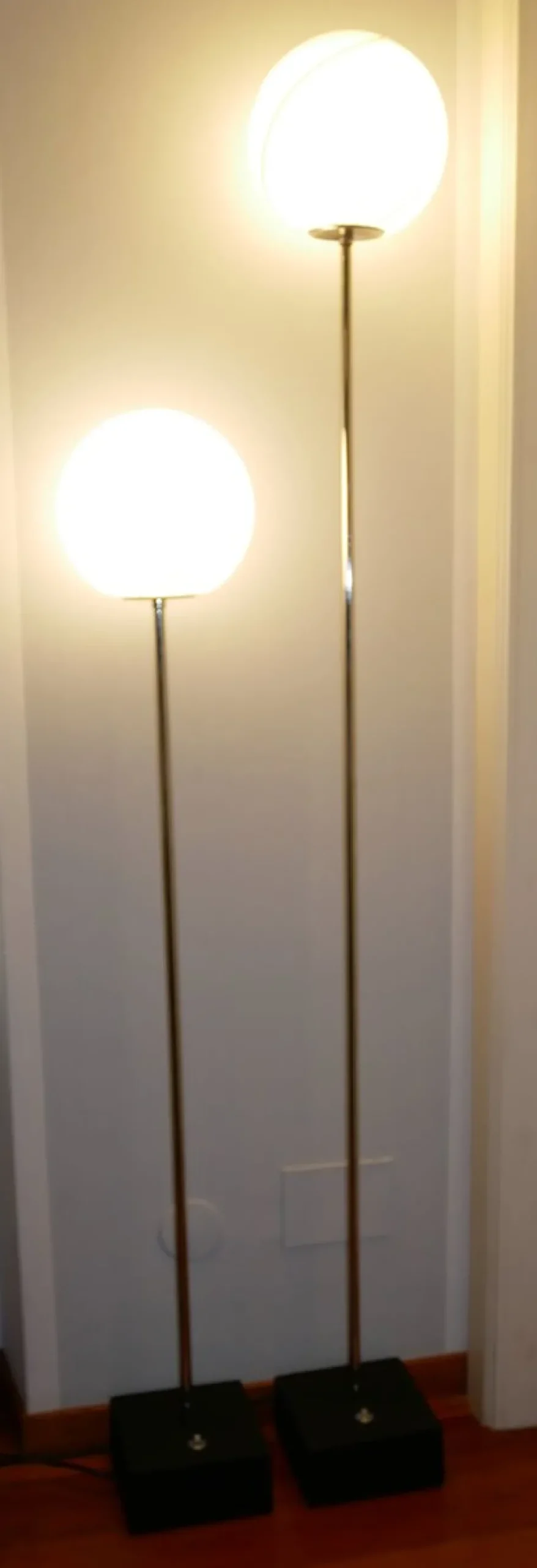 Pair of lamps with chromed metal stems, black lacquered cast iron base and decorated white Murano glass spheres.