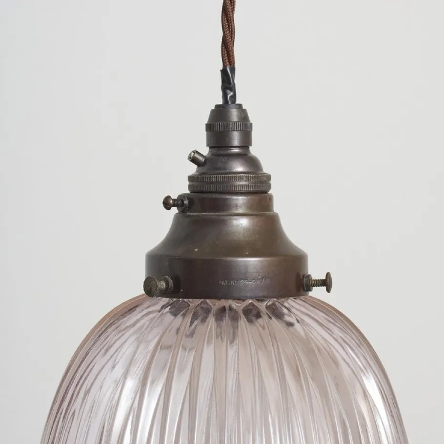Workshop Report: The workshop team inspect all products and perform any necessary repairs to ensure many more years of future use, with lighting we deep clean the shades and professionally remove all existing electrical components and fit new CE certified electrical fittings. This light is supplied with new period style brown twisted 3 core fabric flex and CE certified B22 bayonet lampholder. ThelLight can take up to 100W Equivalent LED bulb. The glass shade doesn’t have any visible chips or cracks, there might be the odd air bubble in the glass from manufacturing. The light is supplied with an aged brass ceiling rose.