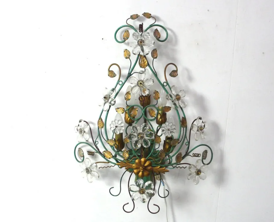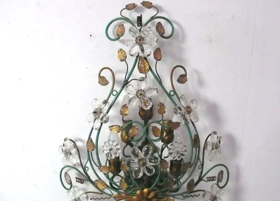 | Restoration and Damage Details | Light wear consistent with age and use, Missing nuts for tightening on three of the flowers in the center, Replaced screws, The bottom glass flower has hada glass petal replaced |