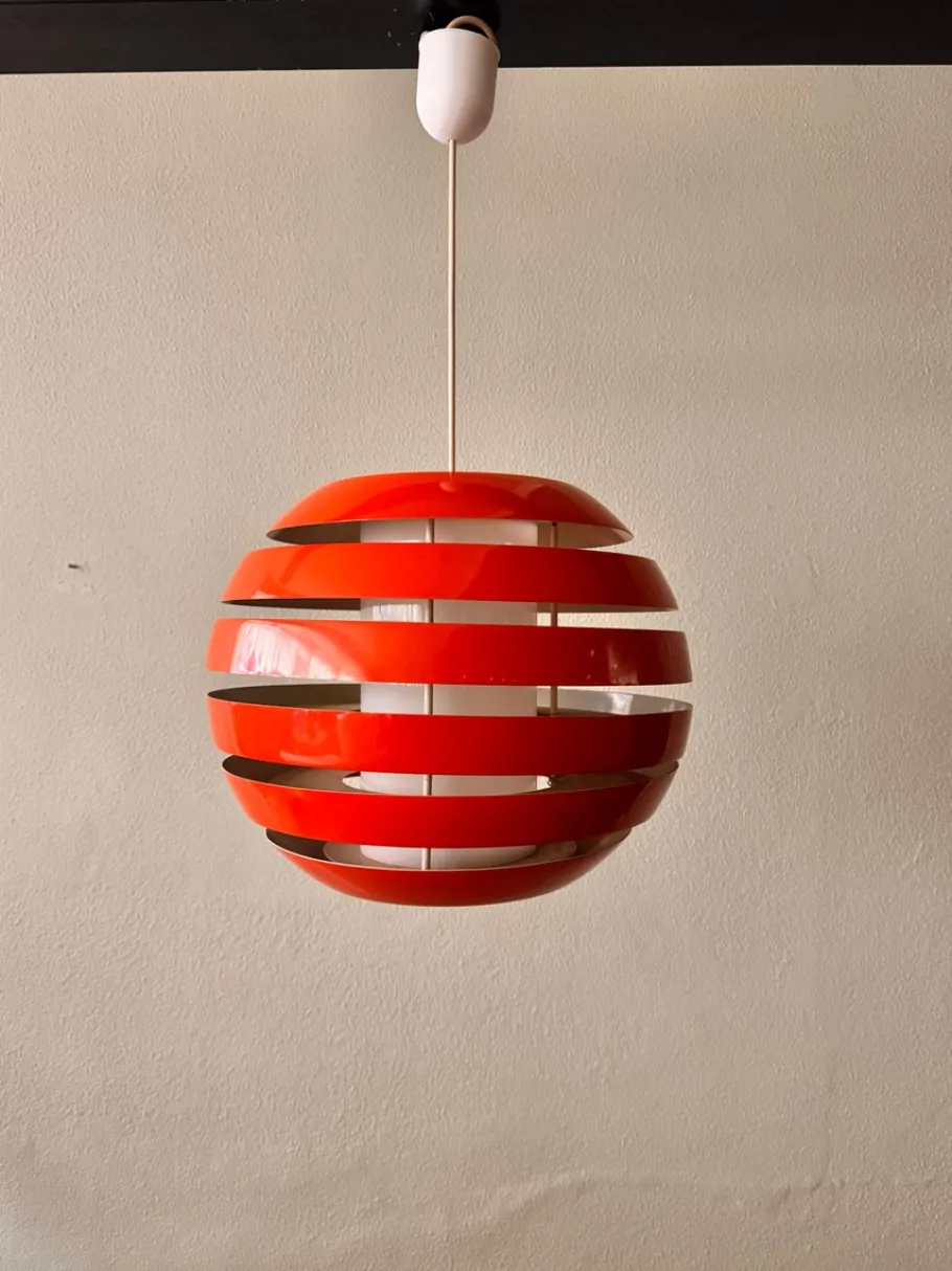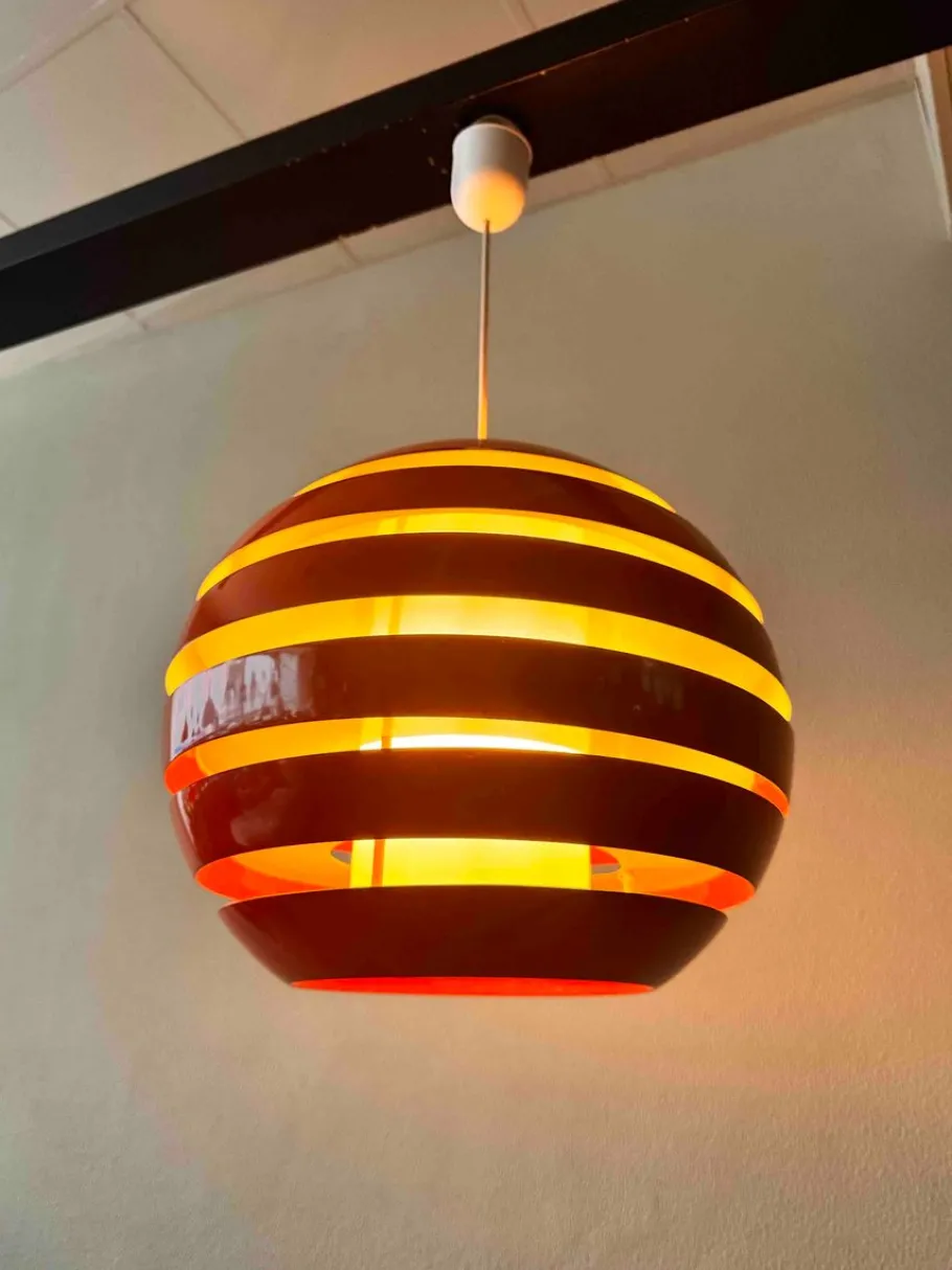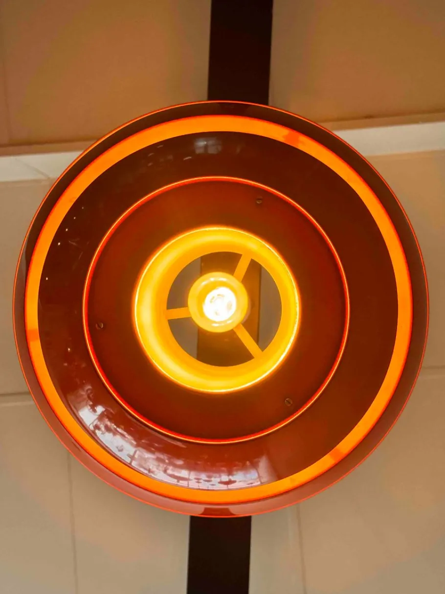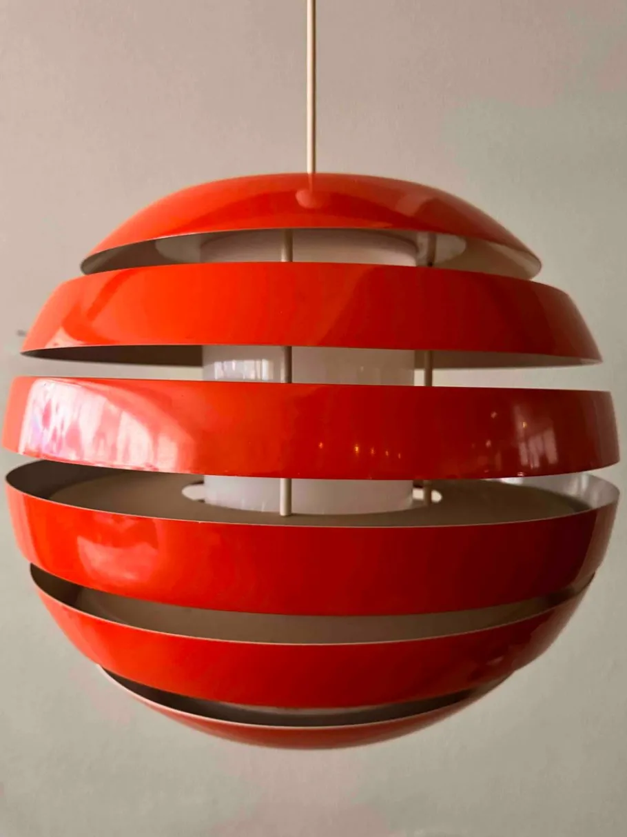 The lamp’s spherical form is composed of stacked, curved metal bands that create a layered effect. Light filters through the gaps between the bands, while the inner cylindrical diffuser softens the glow, providing ambient illumination with minimal glare. When lit, the orange hue intensifies, casting a warm and inviting light.