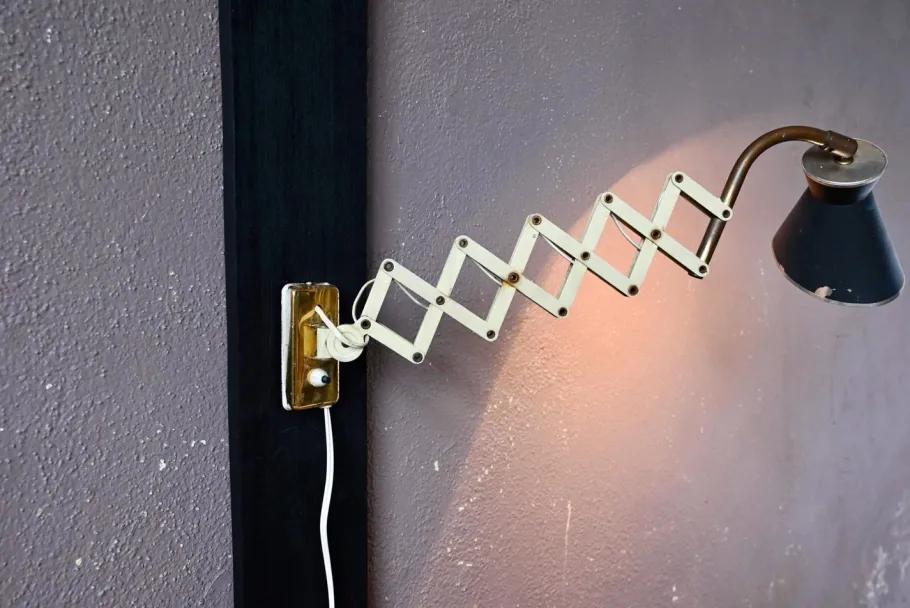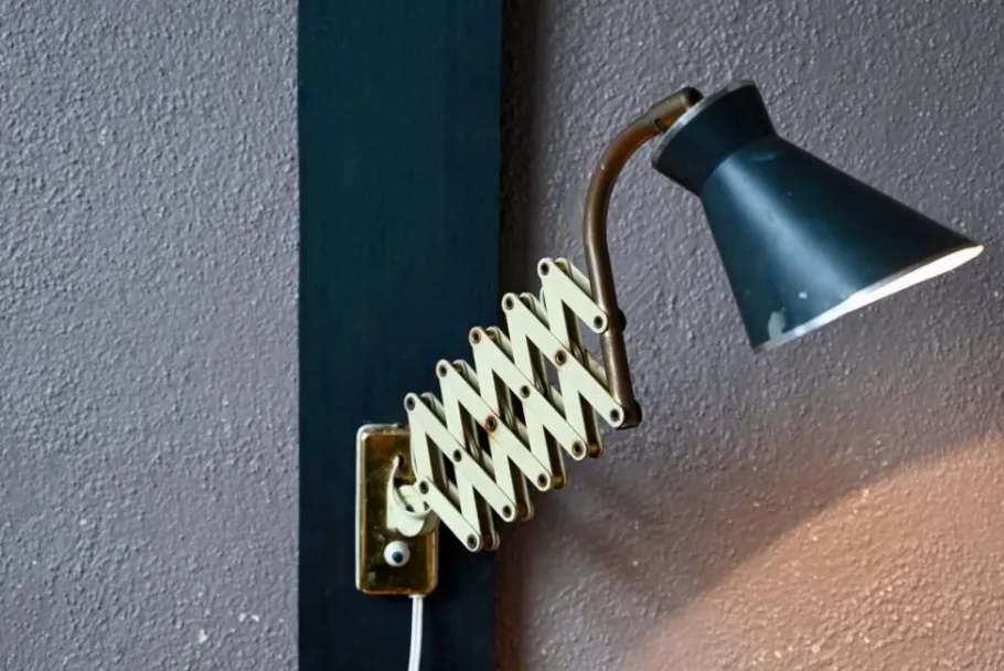 Midcentury scissor wall lamp black and gold gallows workshop design