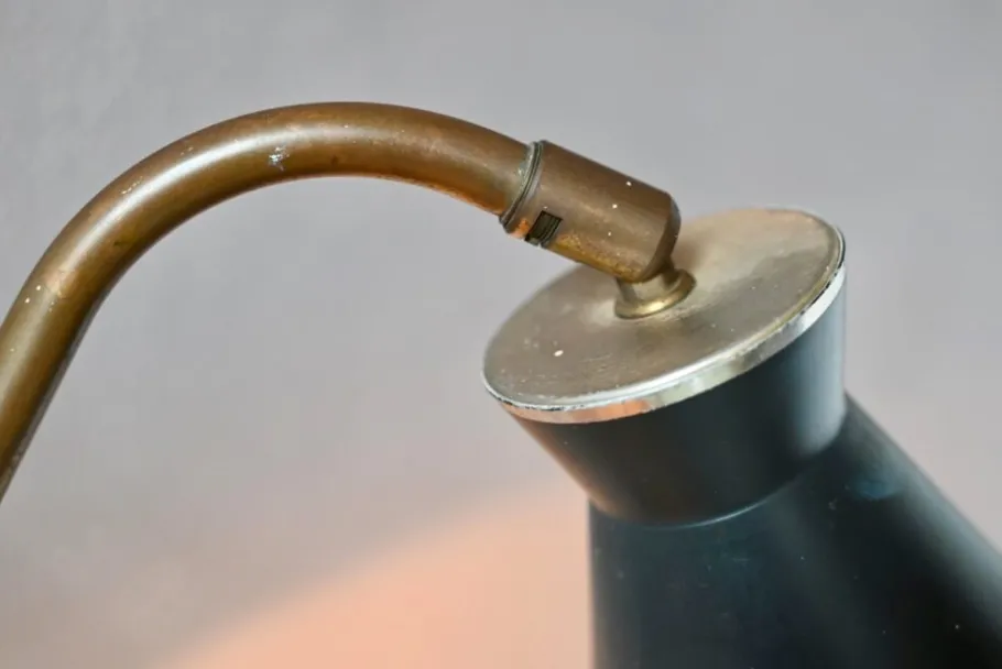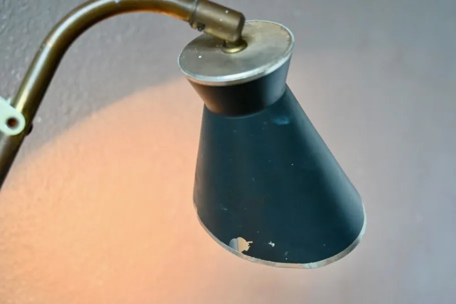 The lamp is in black and gold metal, in good condition. Wall-mounted, it can be fixed using a bracket system to be screwed into the wall. Adjustable in height and length thanks to the accordion system, its deflector is also adjustable. The original switch is located on the wall hook. Traces of time can be noted on the paint of the deflector as well as paint stains.