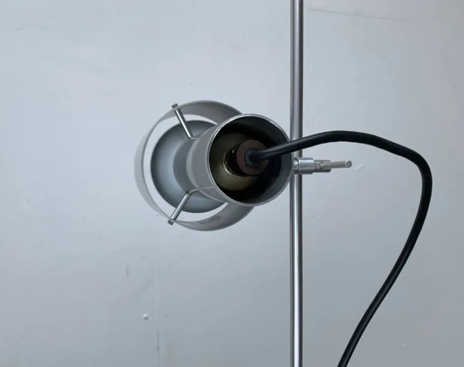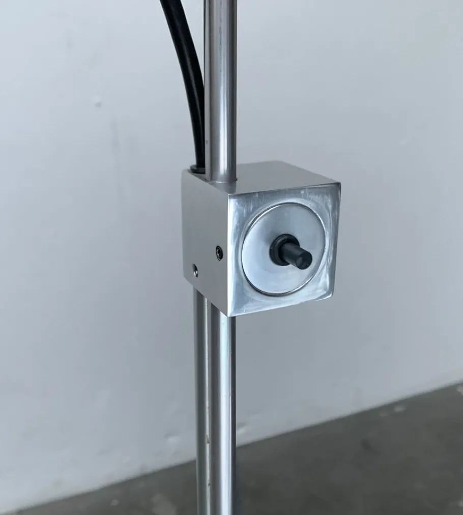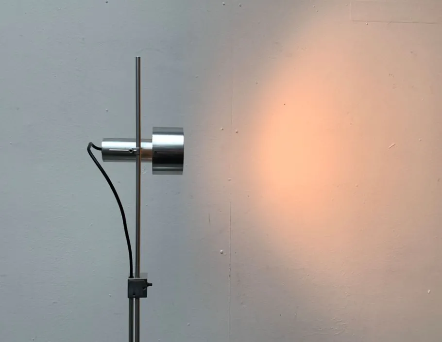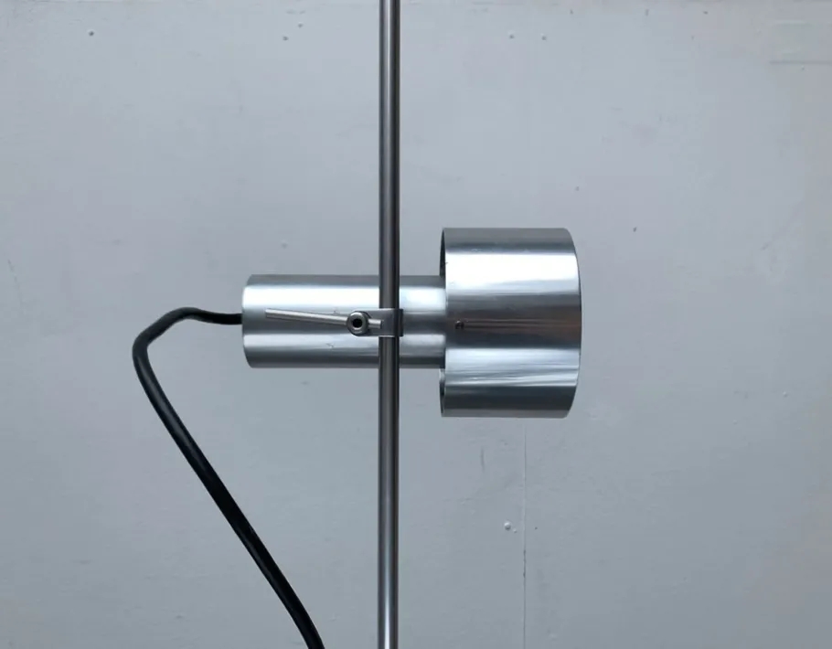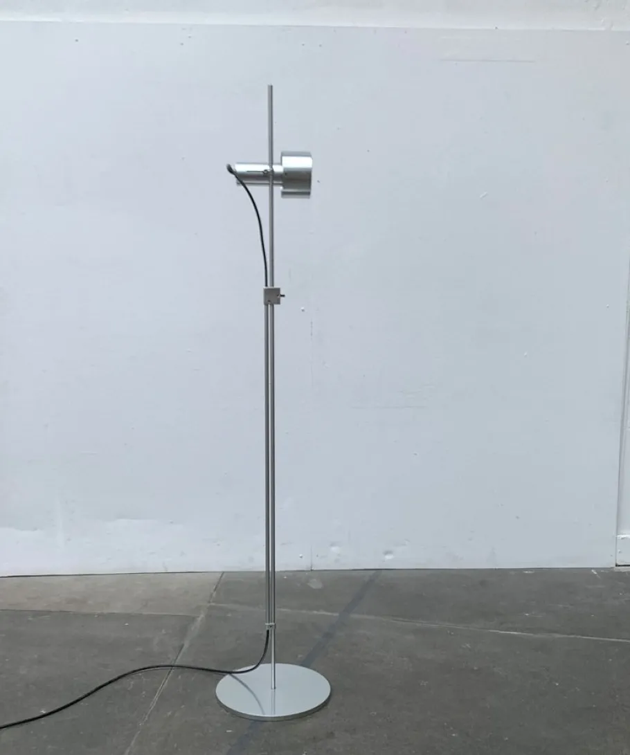 The design language and materiality of Nelson’s designs reflect its background in the aviation industry. Aluminum as a “signature material” and “engineering” precision and processing. His luminaire designs are characterized by puristic aesthetics that inherent functional and technical details. This floor lamp is designed in a combination of brushed aluminum and chrome -plated steel. The finely and thinly carried out rod is the lamp made of full material on which the spotlight attacks. A trademark of these lights is the characteristic “Cube Switch Box”, a simple box made of milled aluminum with integrated pressure switches. The lamp is labeled under the foot.