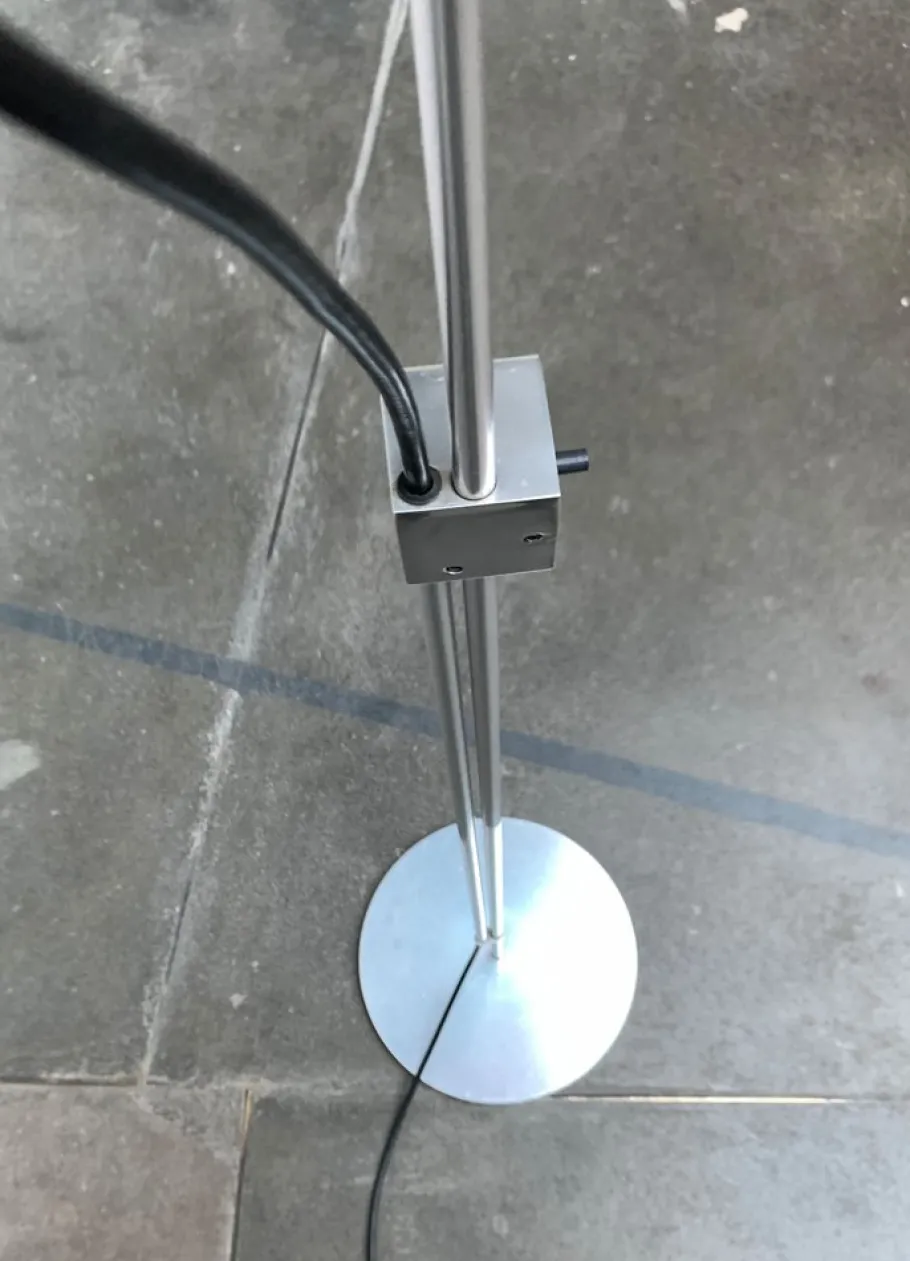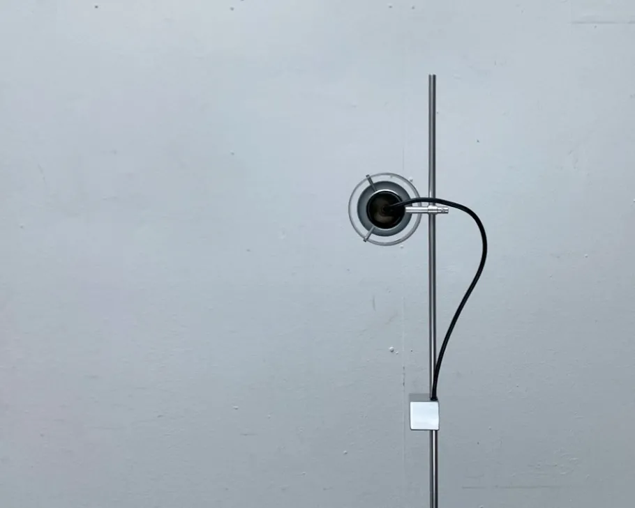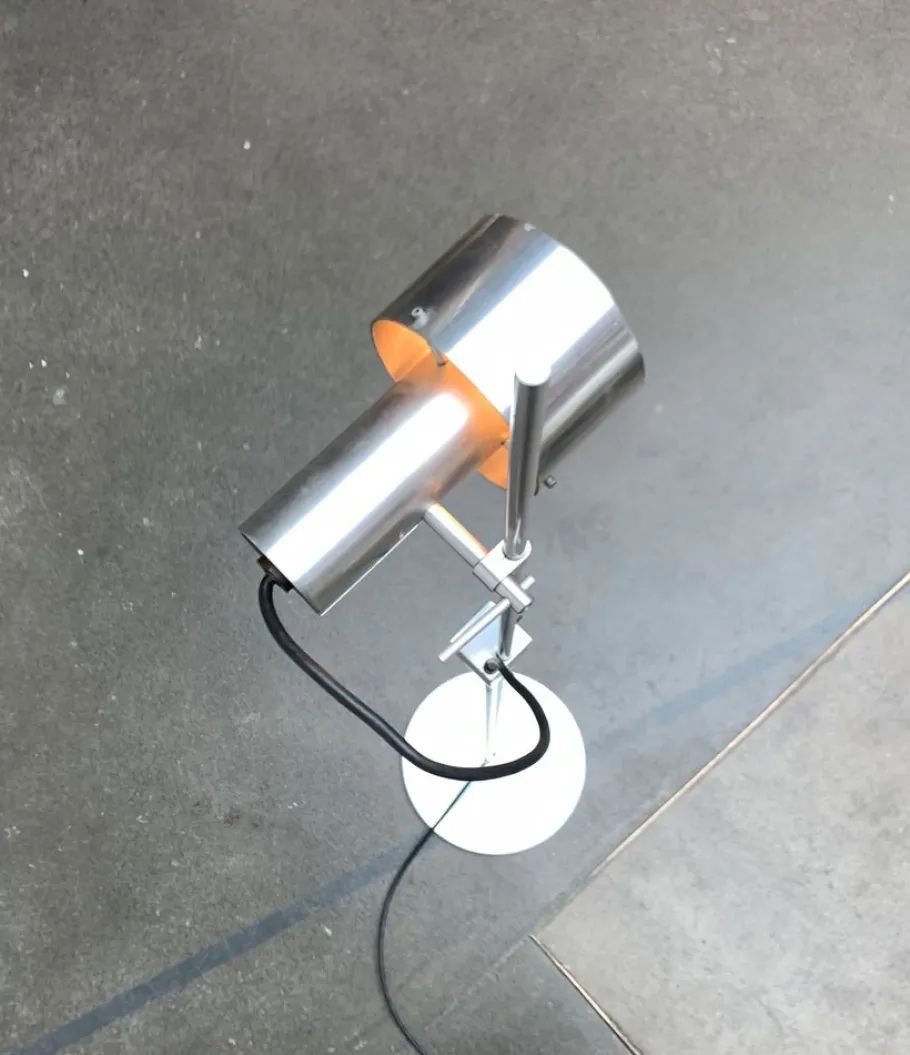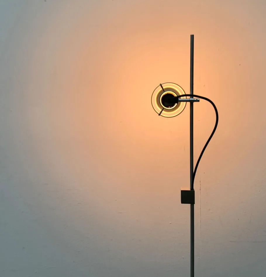 The design language and materiality of Nelson’s designs reflect its background in the aviation industry. Aluminum as a “signature material” and “engineering” precision and processing. His luminaire designs are characterized by puristic aesthetics that inherent functional and technical details. This floor lamp is designed in a combination of brushed aluminum and chrome -plated steel. The finely and thinly carried out rod is the lamp made of full material on which the spotlight attacks. A trademark of these lights is the characteristic “Cube Switch Box”, a simple box made of milled aluminum with integrated pressure switches. The lamp is labeled under the foot.