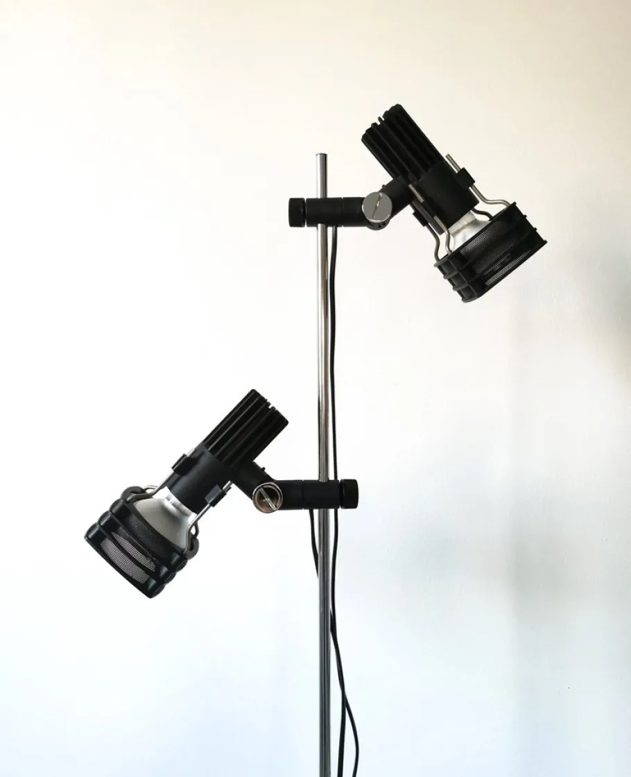 It consists of chrome-plated metal and black plastic elements.