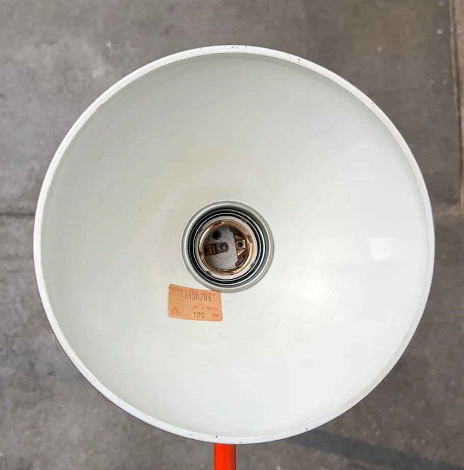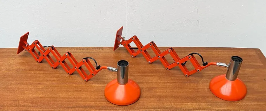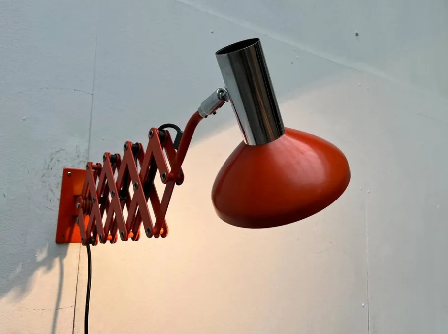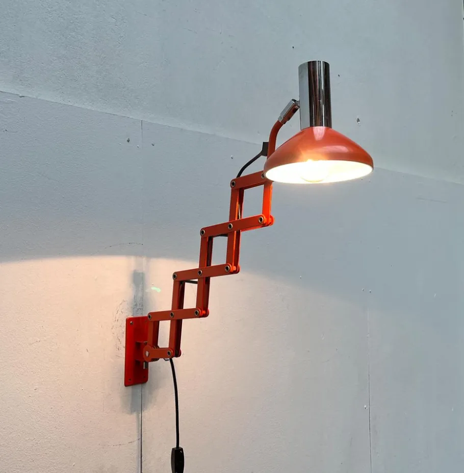 The lamp head has a simple spotlight shape. It can be aligned within a certain radius using a joint. The shade and the lamp body are orange. The joints, levers and the light dome are set off in chrome. The scissor system makes the lamp particularly flexible. In addition to the extension via the scissors, the lamp can be swiveled and tilted.
