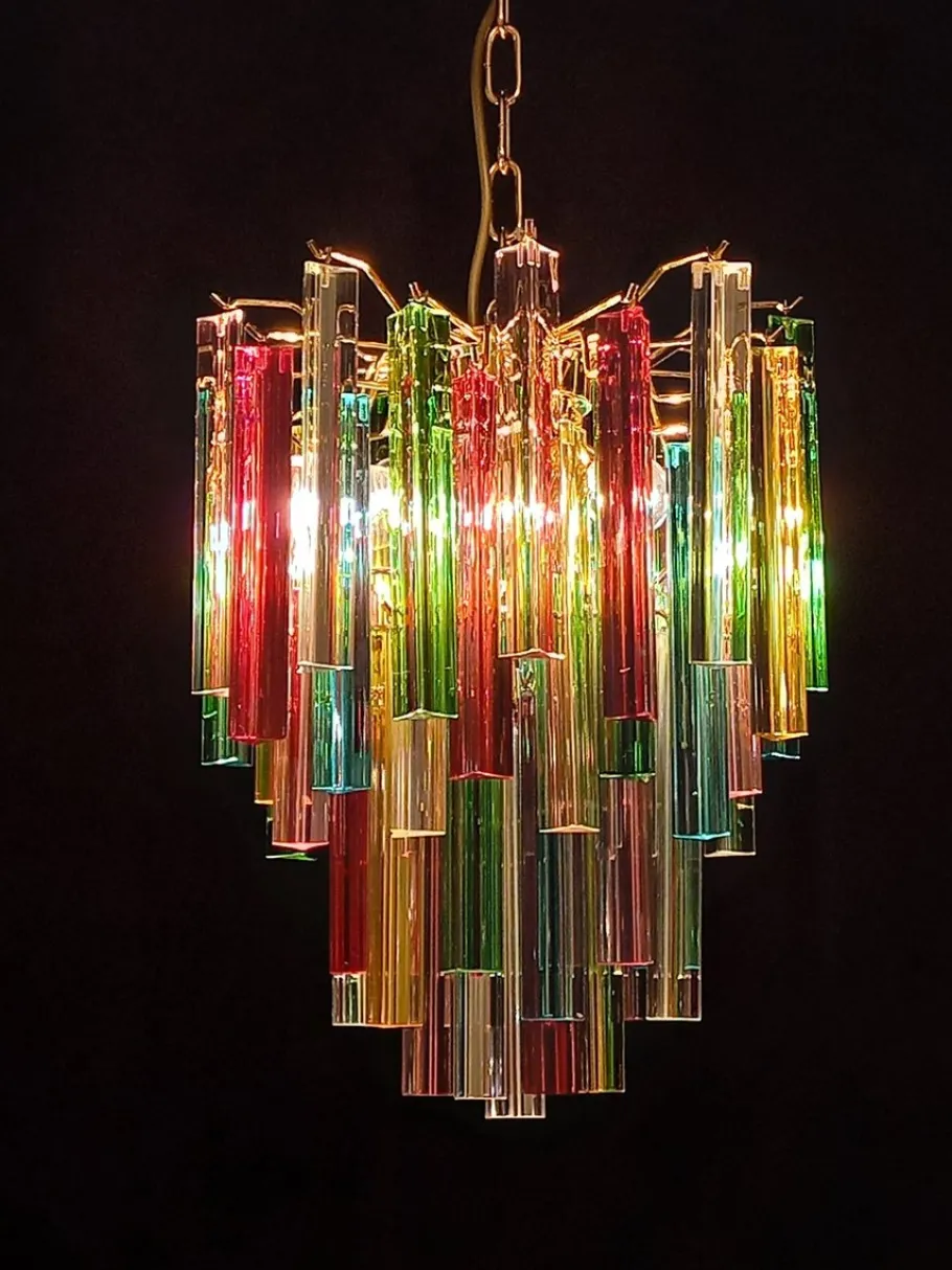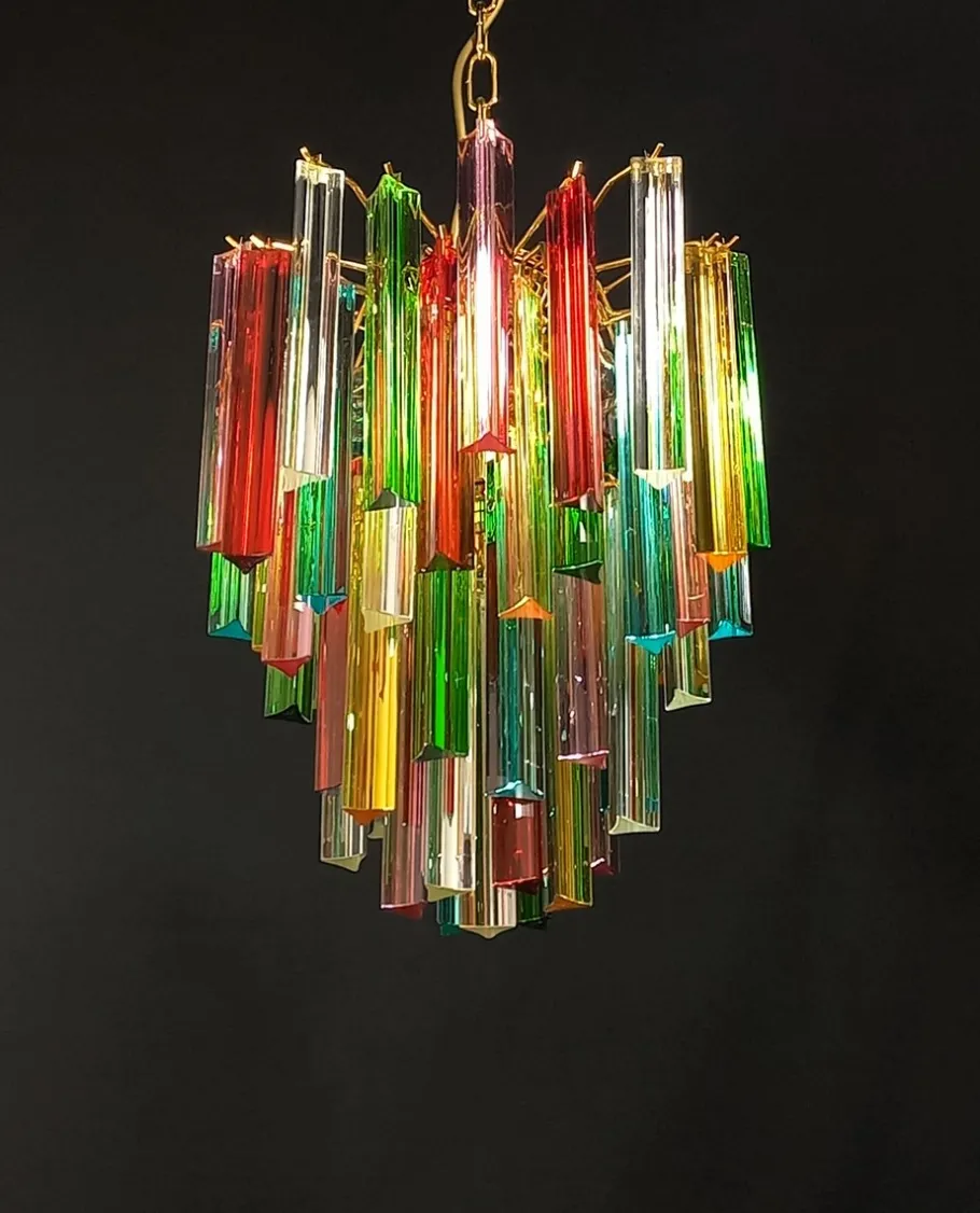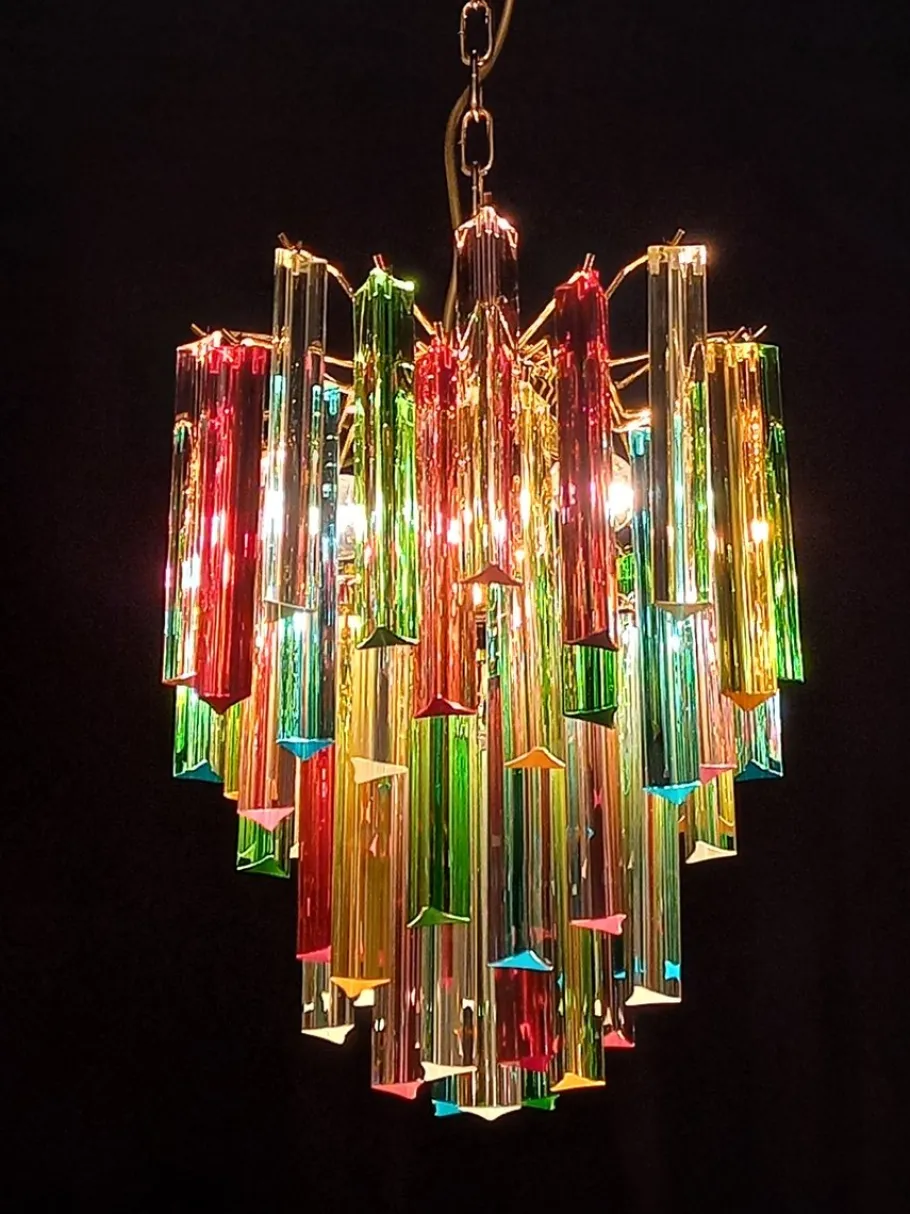 Glass Color: Murano glass colored crystal trihedral prisms, in the colors crystal, red, green, aquamarine blue, amber and pink.