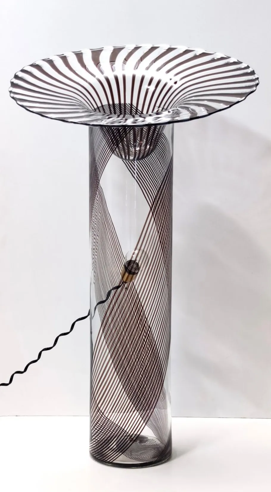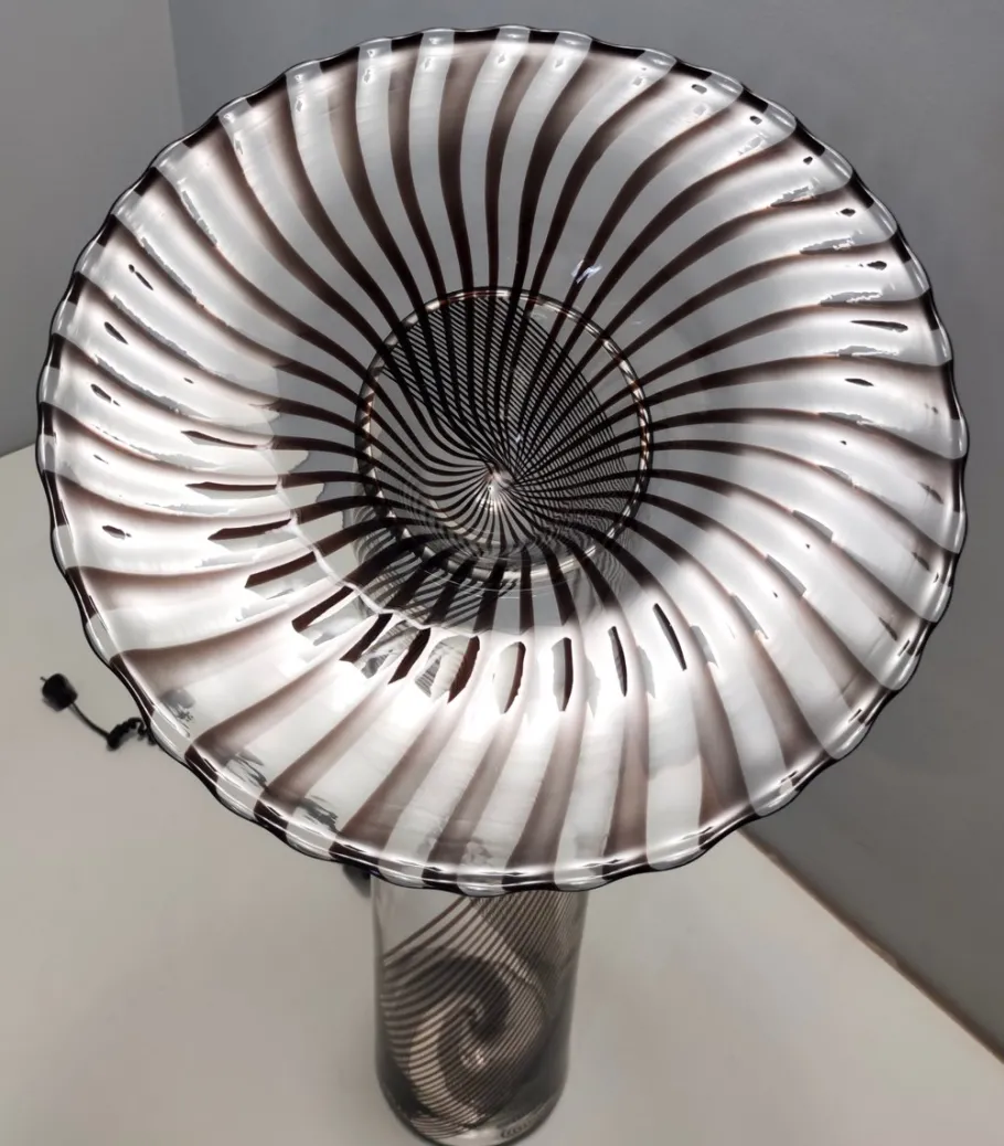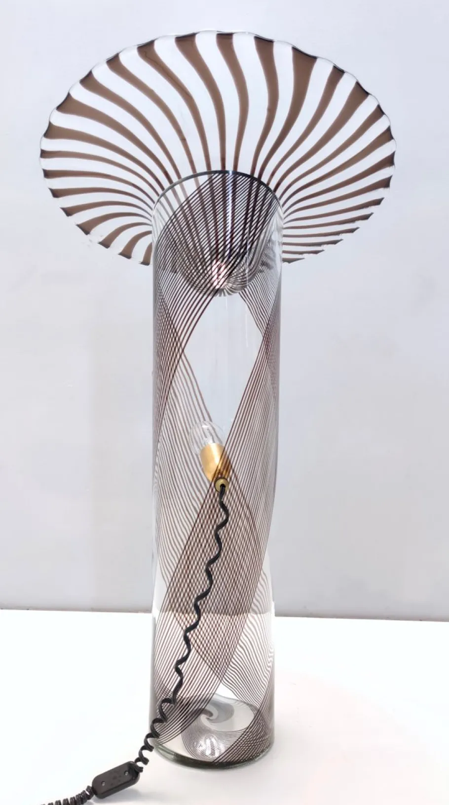 It is made when Lino was artist director and primo maestro at La Murrina. Looking closely to the piece, on the cylinder there are two bands of 42 canes each. Probably the clear space is made with clear canes. Whoever has seen rolling up the glass on the bed of filigree understands the skill required to pick two bands of 42 canes exactly opposite. Then blowing with the swirl centered and keeping such a perfect design. The idea behind this sculpture was to cut the cylinder in an angle and have the top vessel staying tilted on the stem, like a flower. Stacking glass pieces is new into murano’s production since their idea was that glass should not touch glass, and this lamp might have been of inspiration to the young chihuly moving his steps at venini and pilchuck. The seaform stacking pieces would come a decade later. It is a vintage piece, therefore it might show slight traces of use, but it can be considered as in excellent original condition.