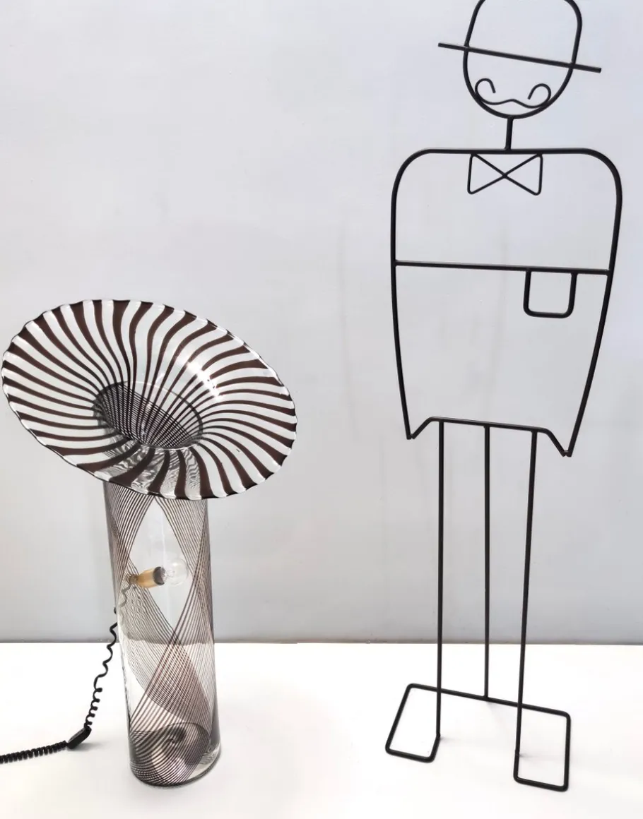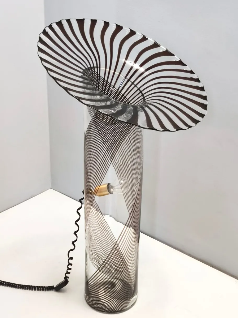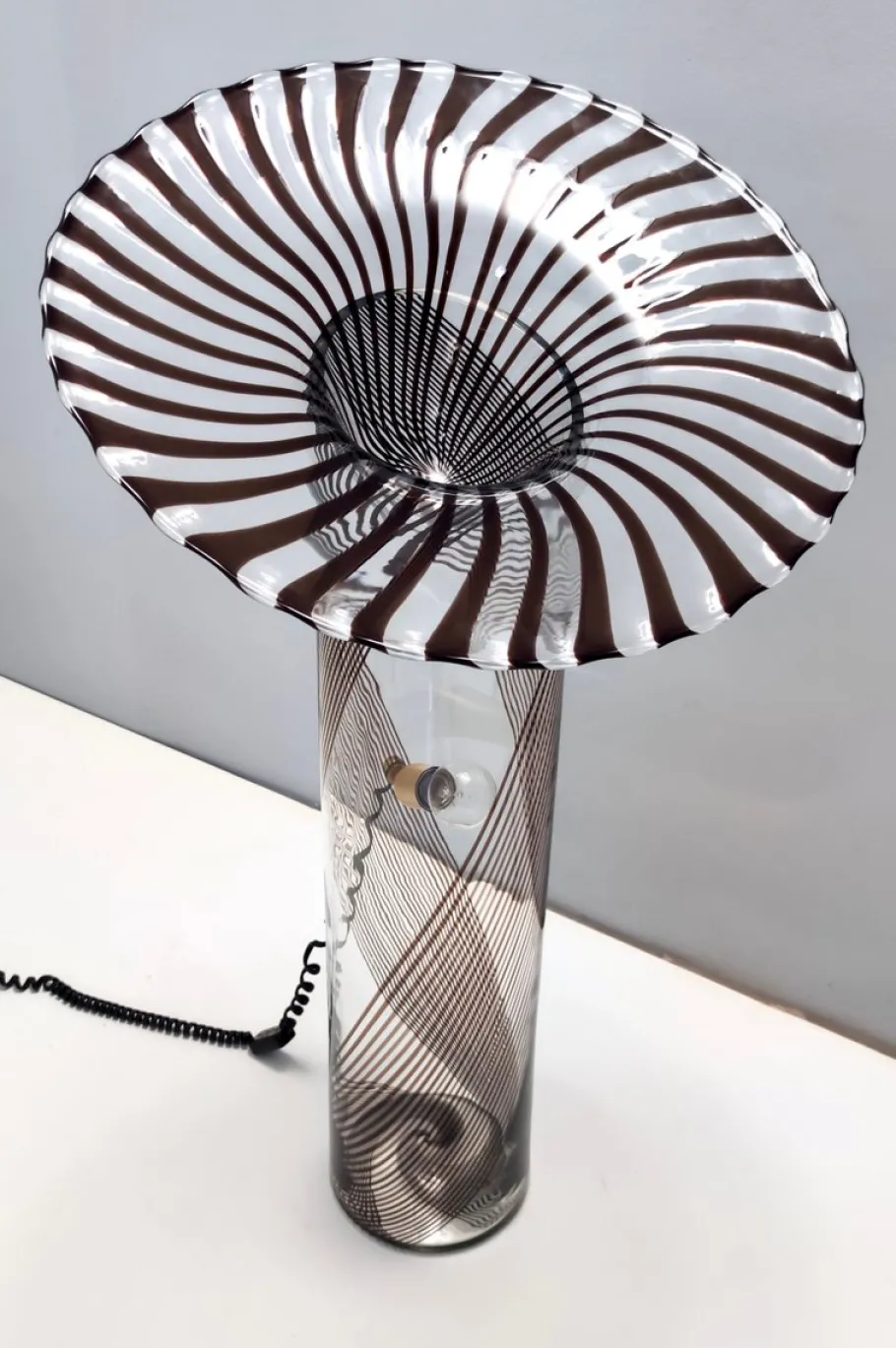 It is made when Lino was artist director and primo maestro at La Murrina. Looking closely to the piece, on the cylinder there are two bands of 42 canes each. Probably the clear space is made with clear canes. Whoever has seen rolling up the glass on the bed of filigree understands the skill required to pick two bands of 42 canes exactly opposite. Then blowing with the swirl centered and keeping such a perfect design. The idea behind this sculpture was to cut the cylinder in an angle and have the top vessel staying tilted on the stem, like a flower. Stacking glass pieces is new into murano’s production since their idea was that glass should not touch glass, and this lamp might have been of inspiration to the young chihuly moving his steps at venini and pilchuck. The seaform stacking pieces would come a decade later. It is a vintage piece, therefore it might show slight traces of use, but it can be considered as in excellent original condition.