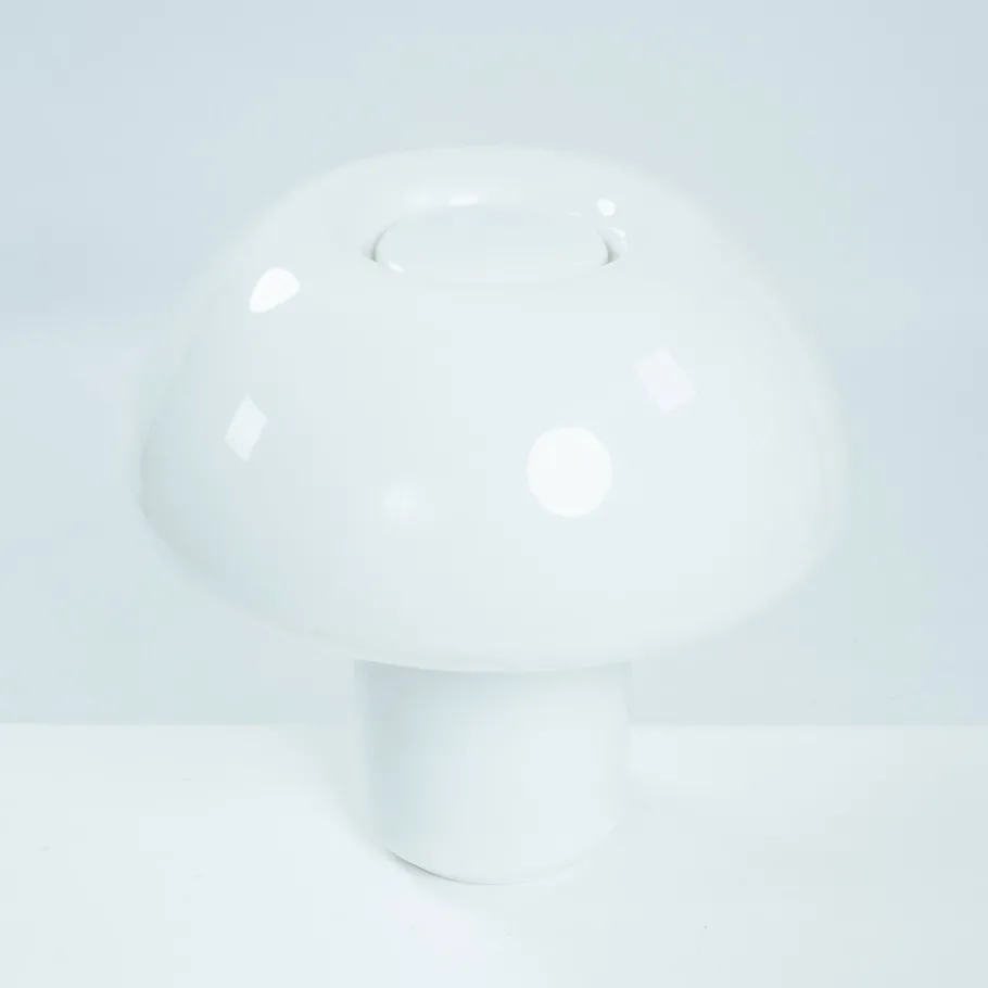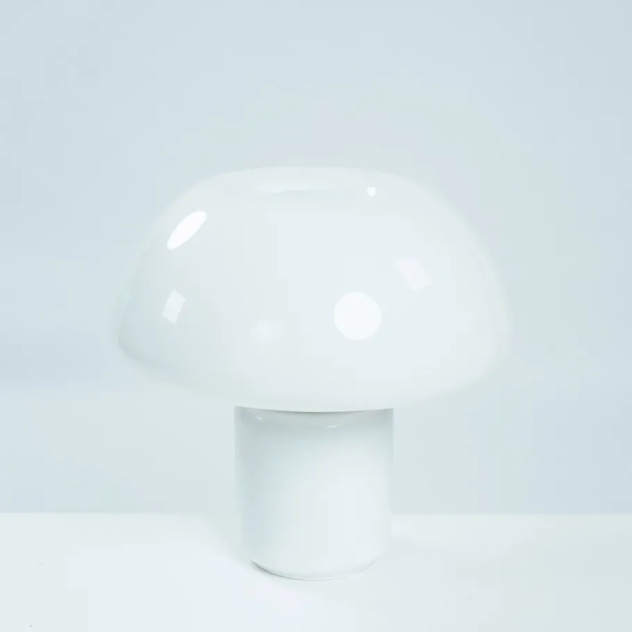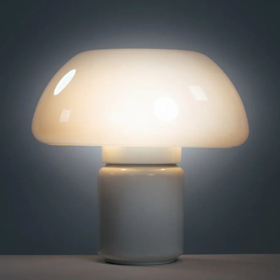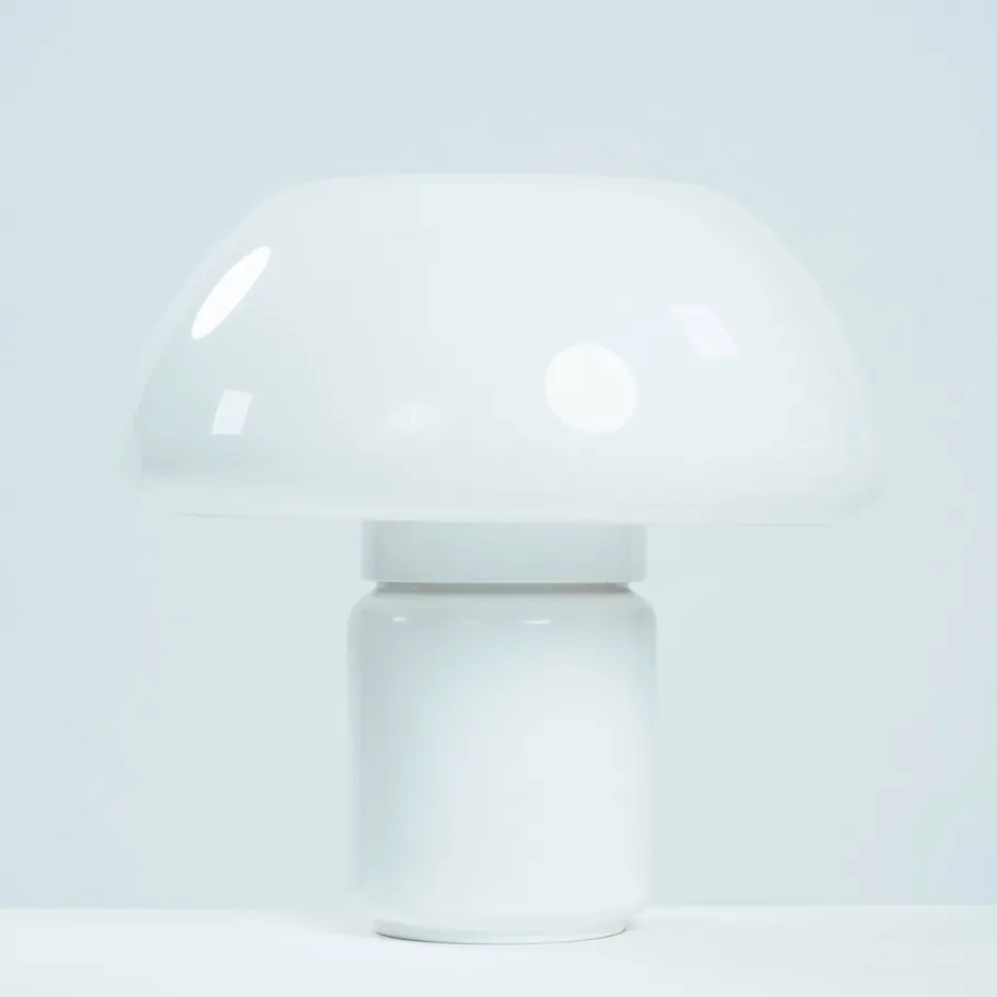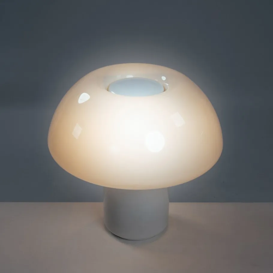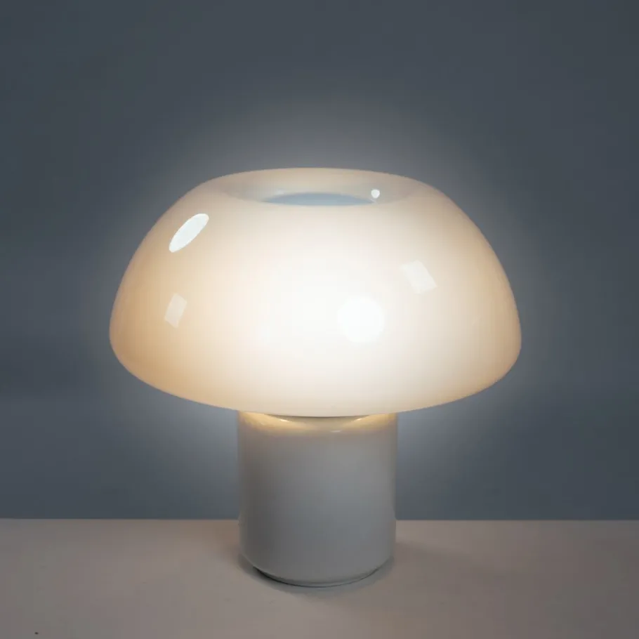 The lamp reflects Martinelli Luce’s early, heavy use of plastics (acrylic/methacrylate) and the brand’s interest in simple geometric volumes.