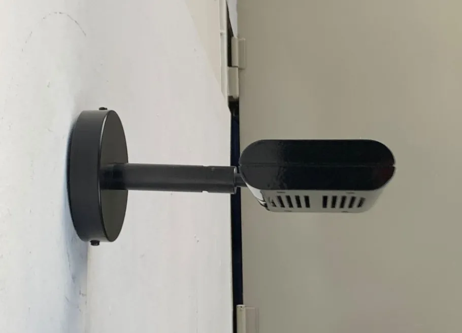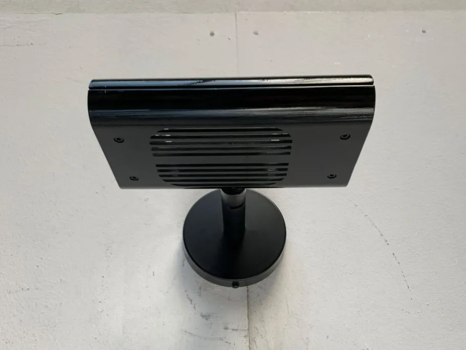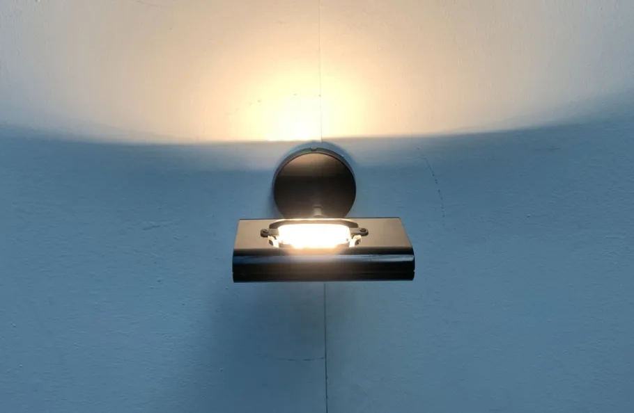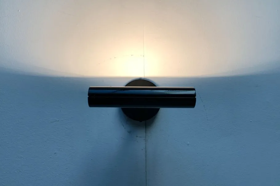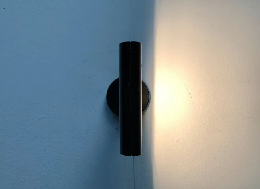 The wall lights version from the well -known Aton light series. A technical design. The luminous body is made of metal and kept in black. The light head is connected to the shaft via a joint and can be aligned as an uplight or downlight and as a ceiling or wall flooder. The base is a simple cylinder with an integrated assembly plate for the wall.
