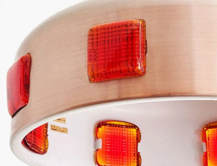 Aluminum shade with inserted transparently red acrylic squares, with a light patina and minor surface wear, see picture, otherwise in wonderful overall condition.