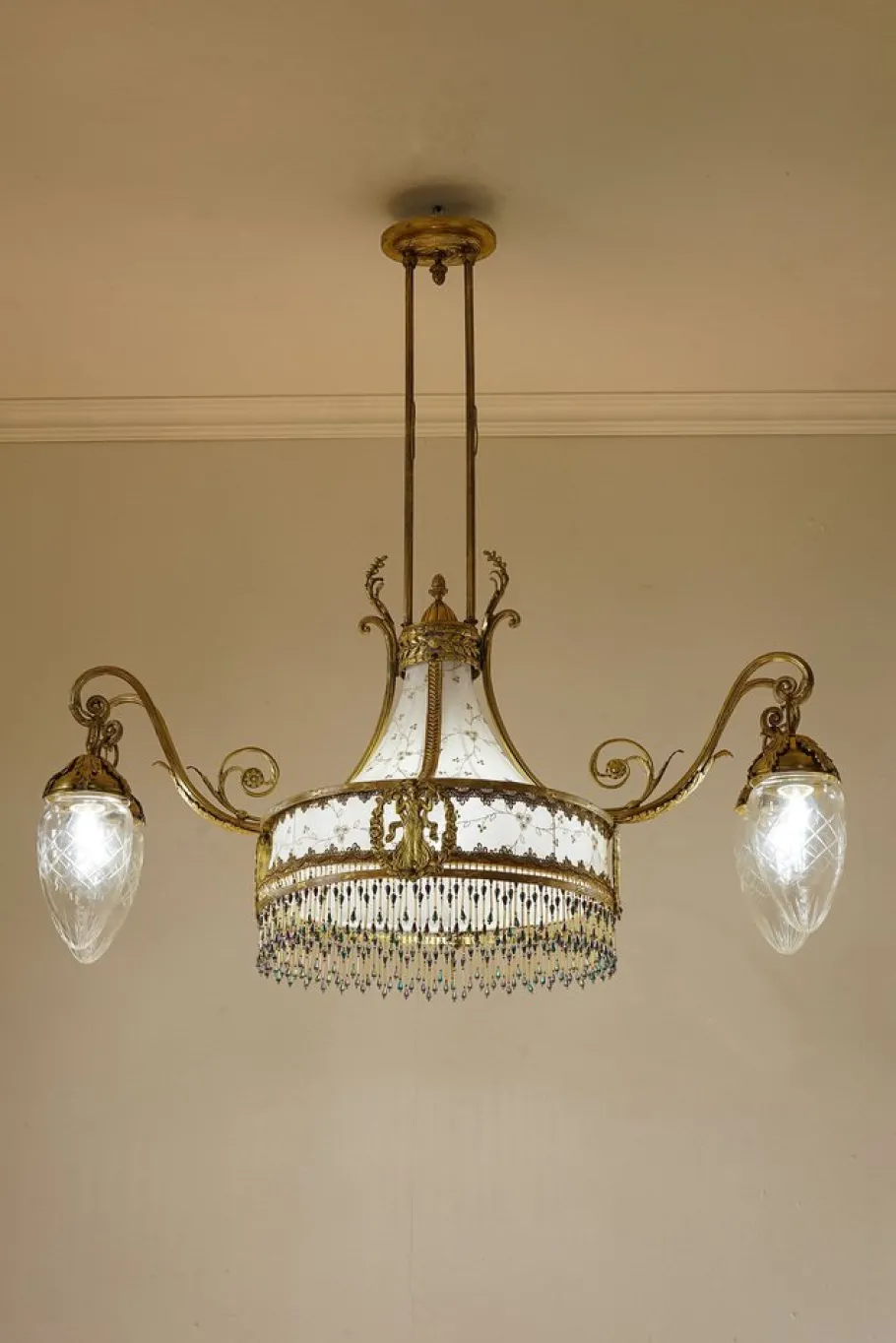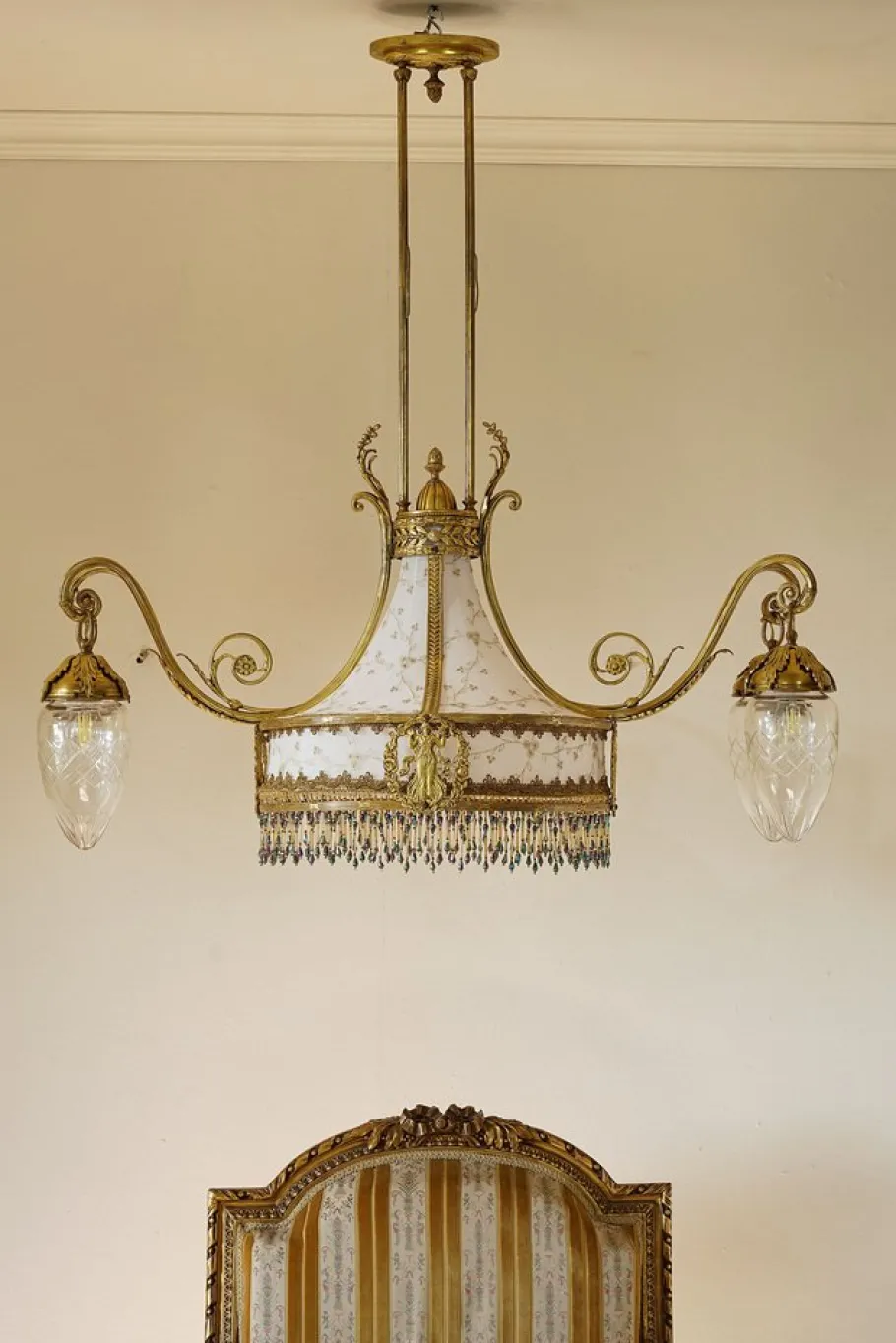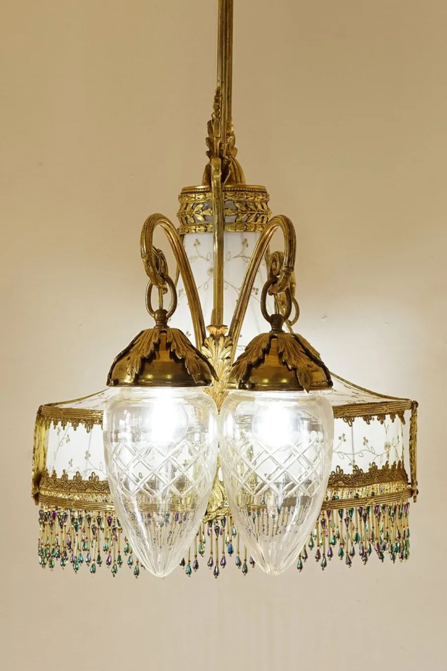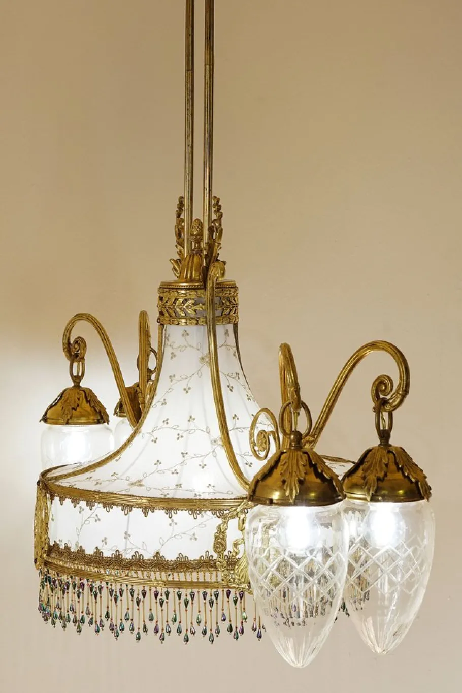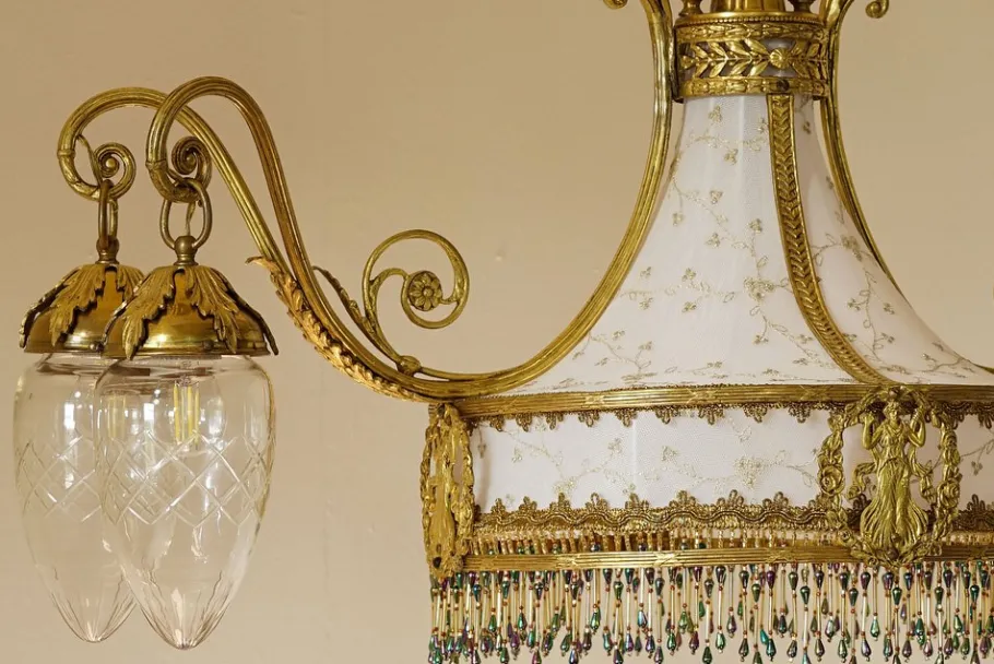 The central part of the chandelier is characterized by a lampted lampshade in “tulle” fabric finely embroidered with golden details. The final part was enriched by a sottana consisting of rows of multicolored beads. The result is a harmonious and decorative composition that is intoned with the rest of the chandelier.