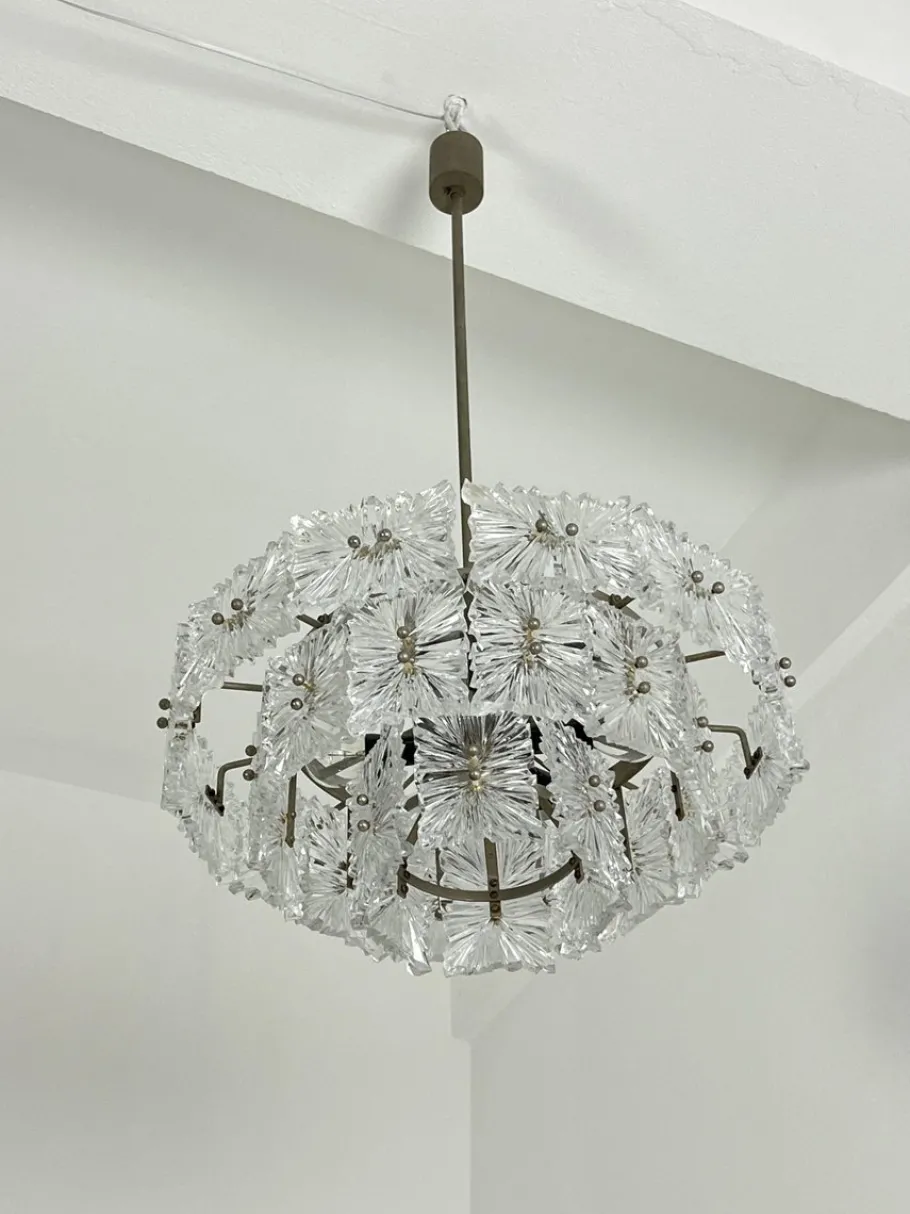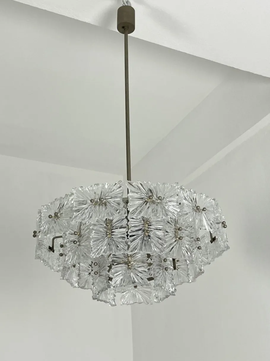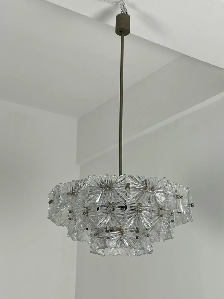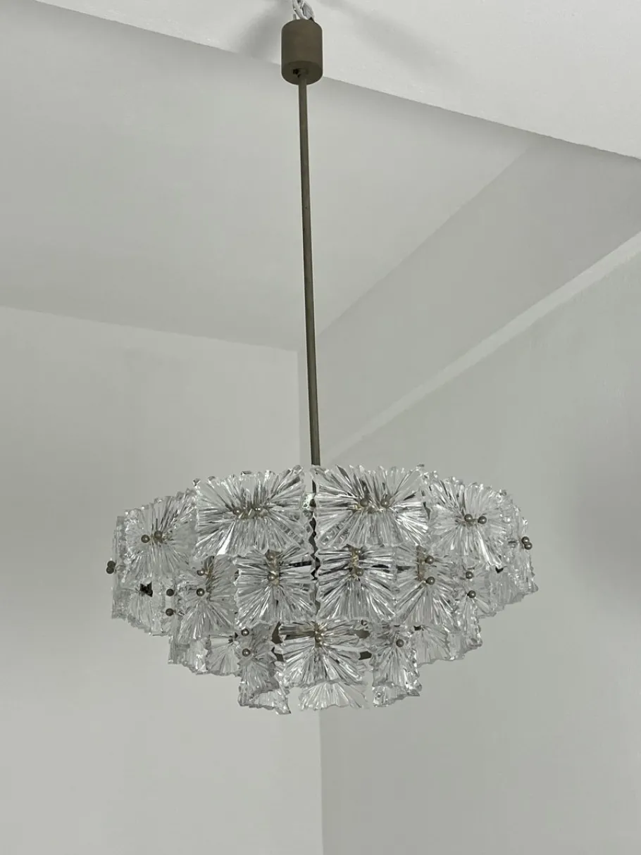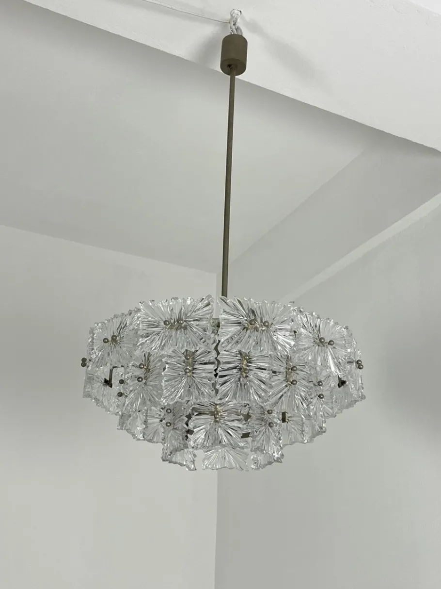 Metal frame, intact glass, the side lamps have E14 sockets, the center lamp has an E27 socket.