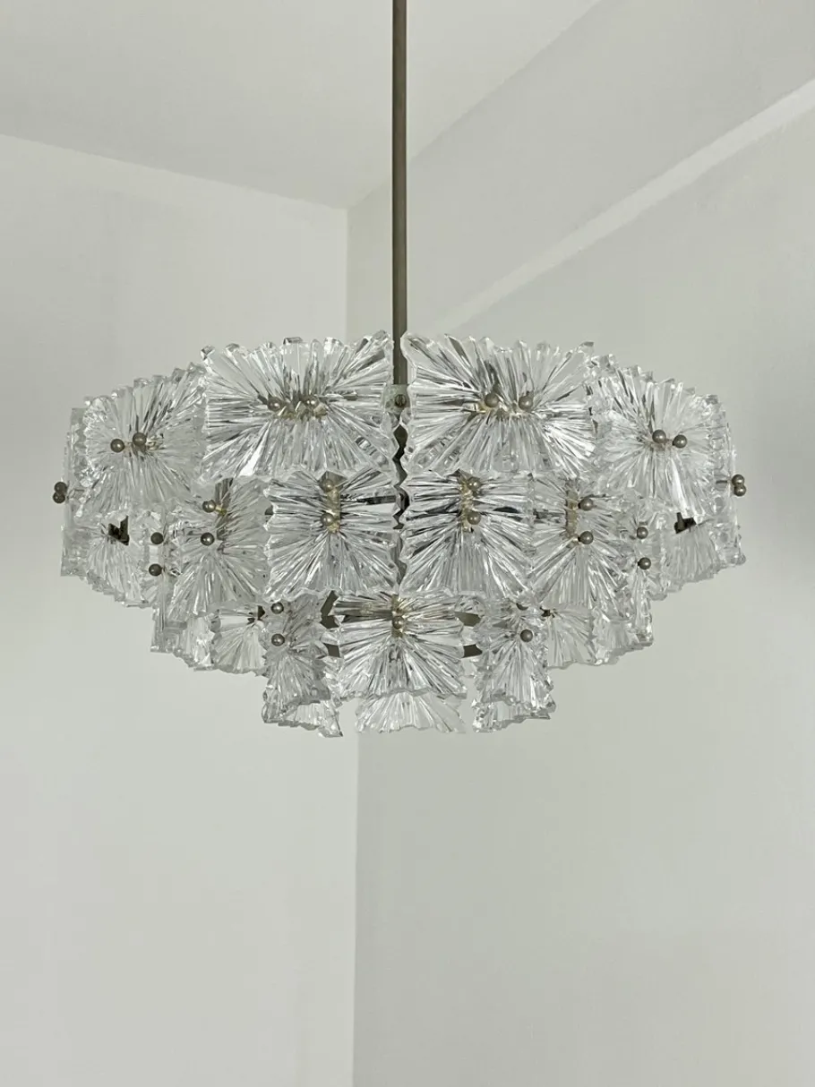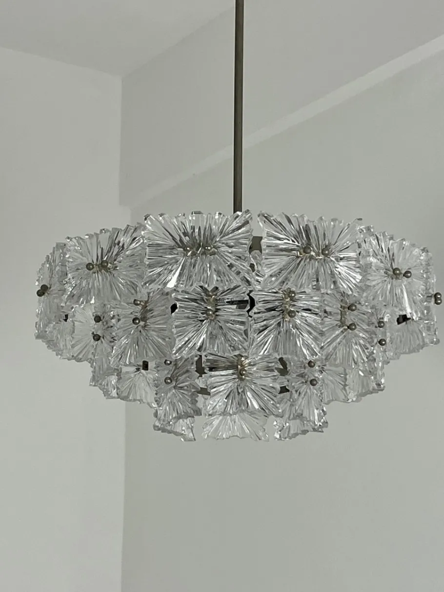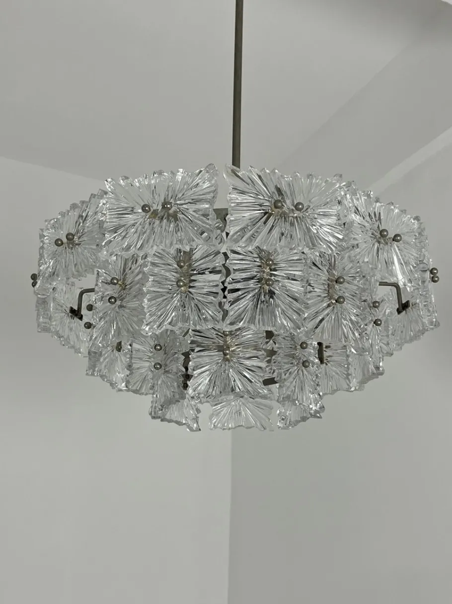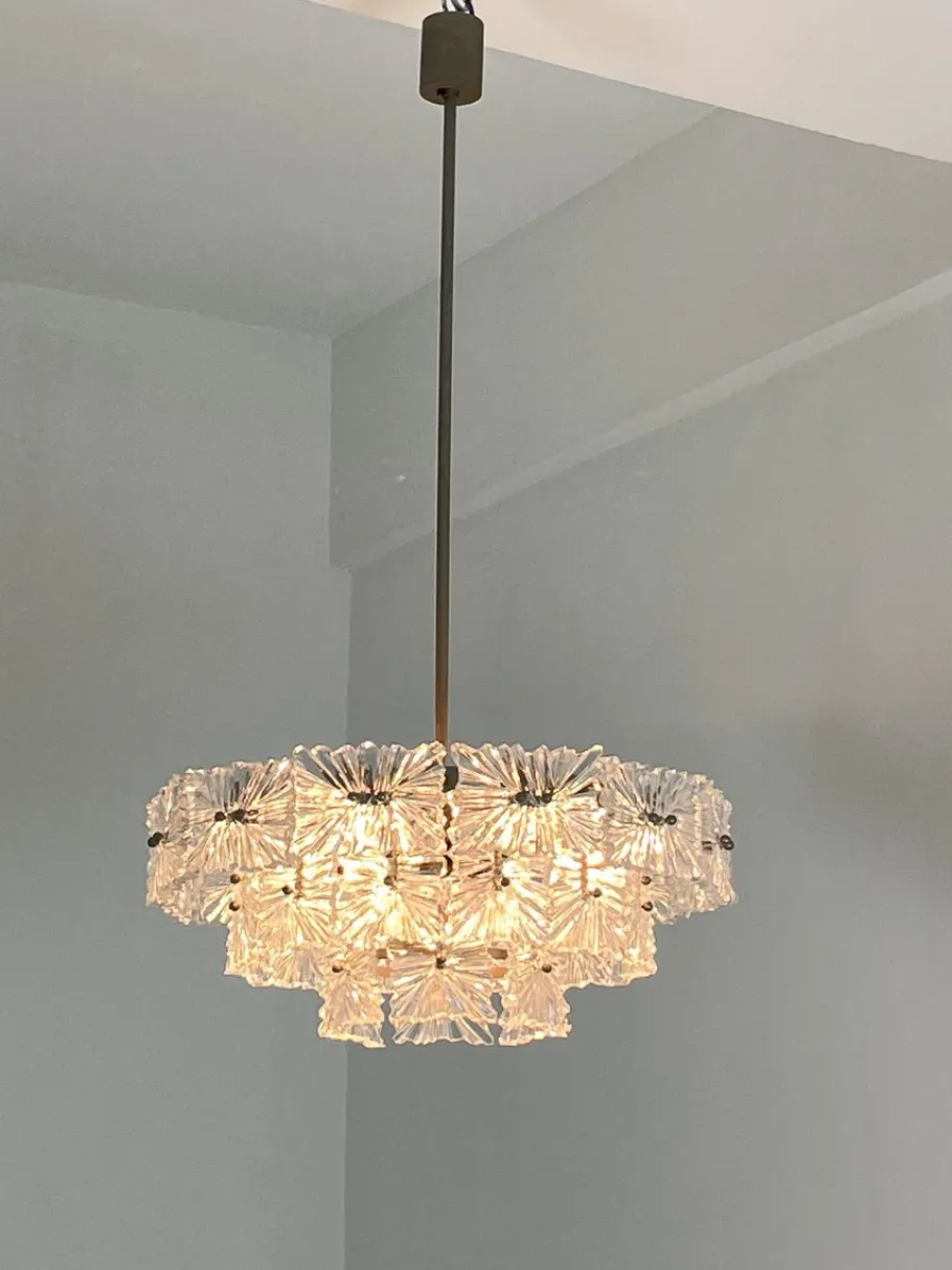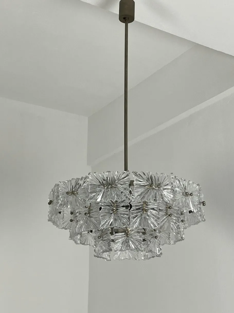 Metal frame, intact glass, the side lamps have E14 sockets, the center lamp has an E27 socket.