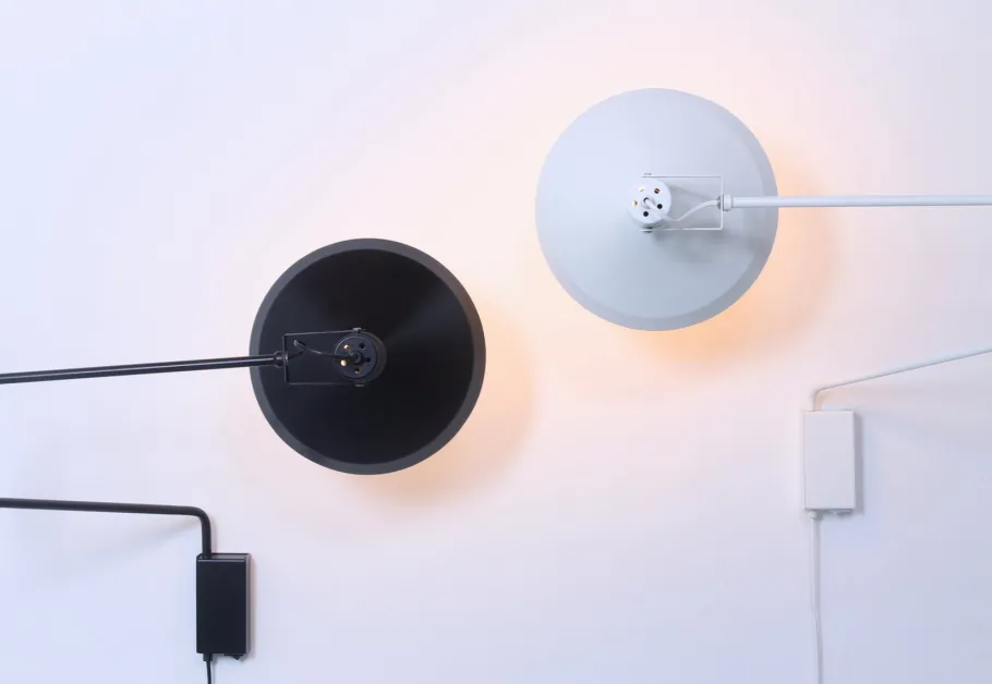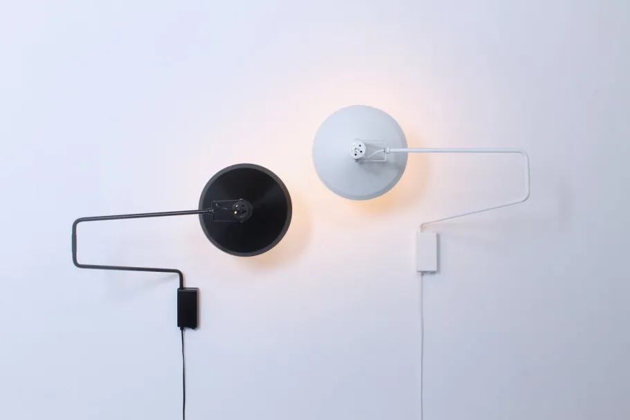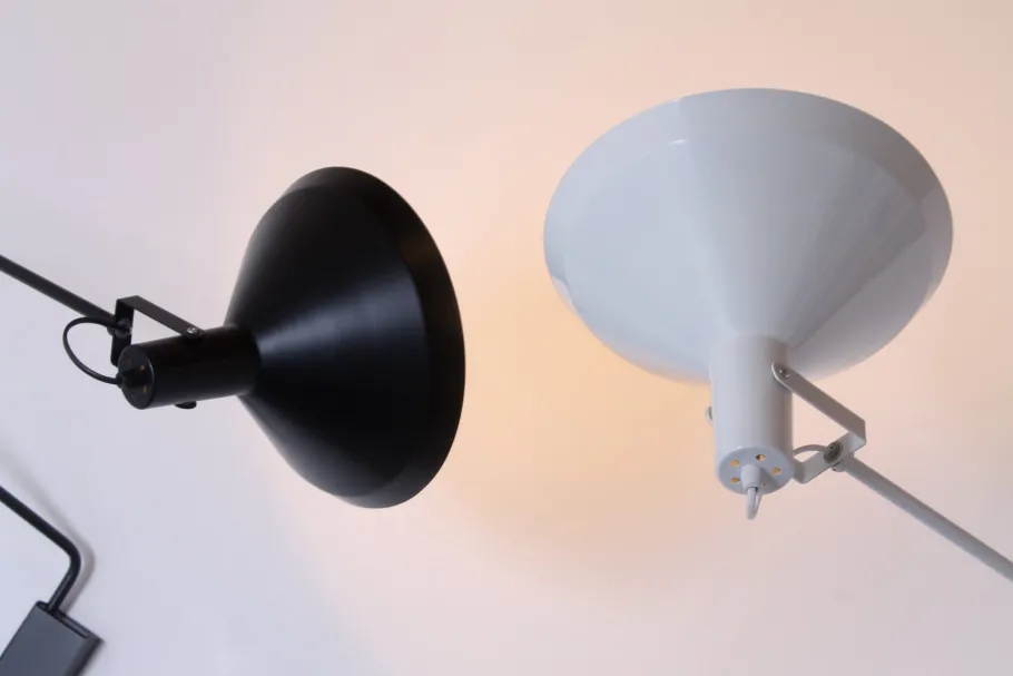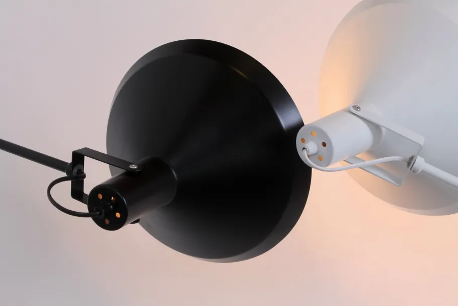 Thanks to the heavy made metal swinging arm suspension the lights can be directed in almost all positions. The 30 cm dia metal shades can also be positioned in all directions.