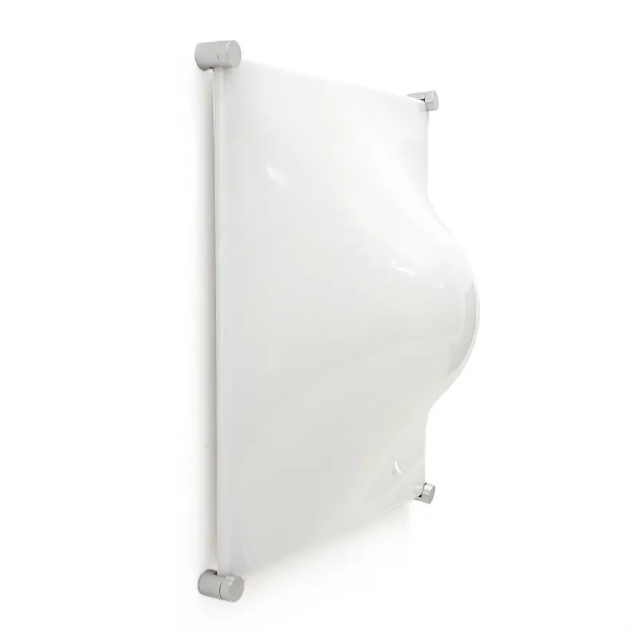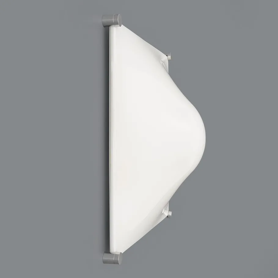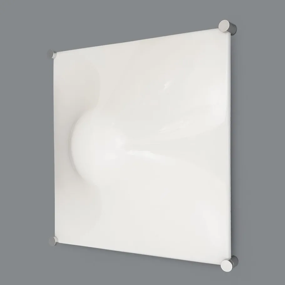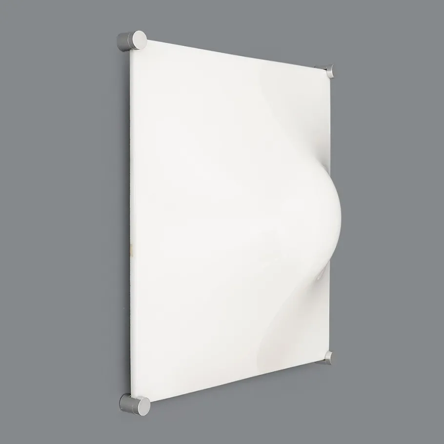 It features a white-painted metal structure, aluminium fixing pins, and a white moulded ABS diffuser with soft, geometric lines.