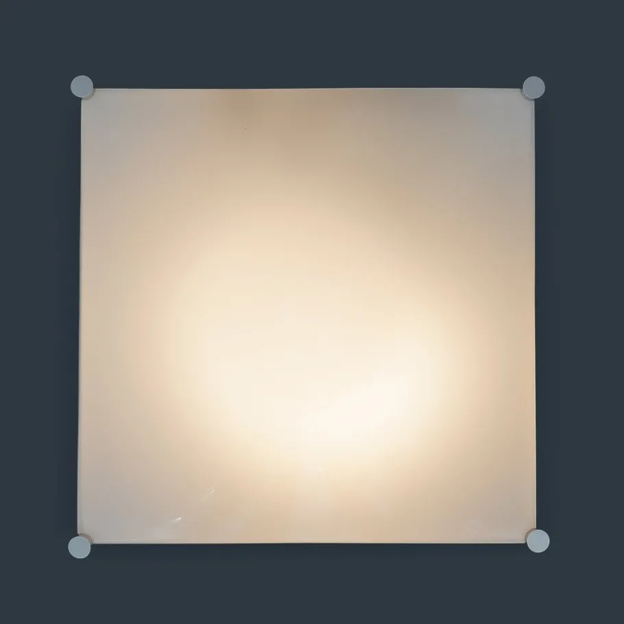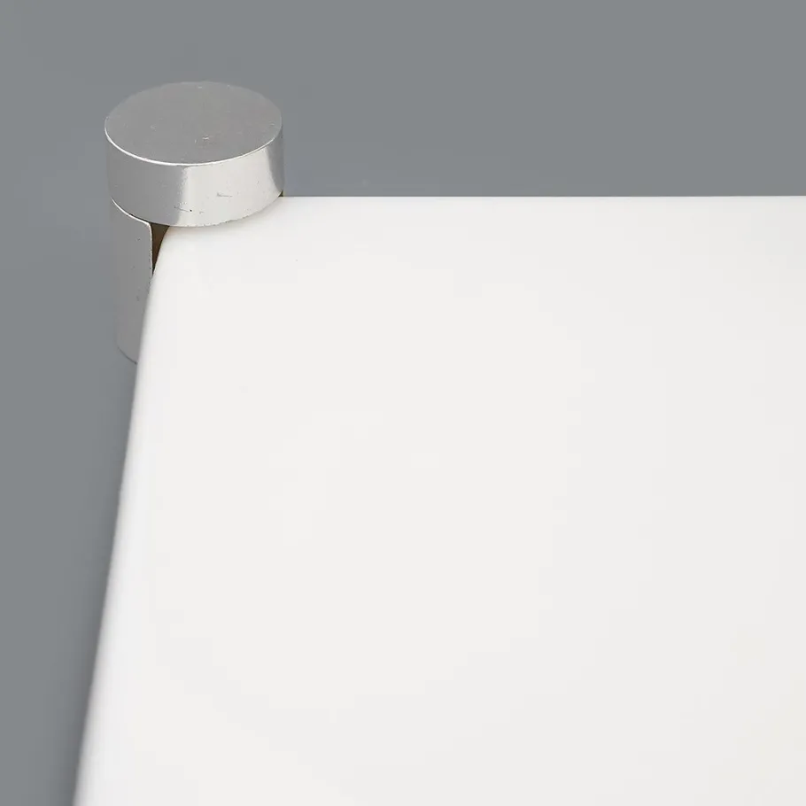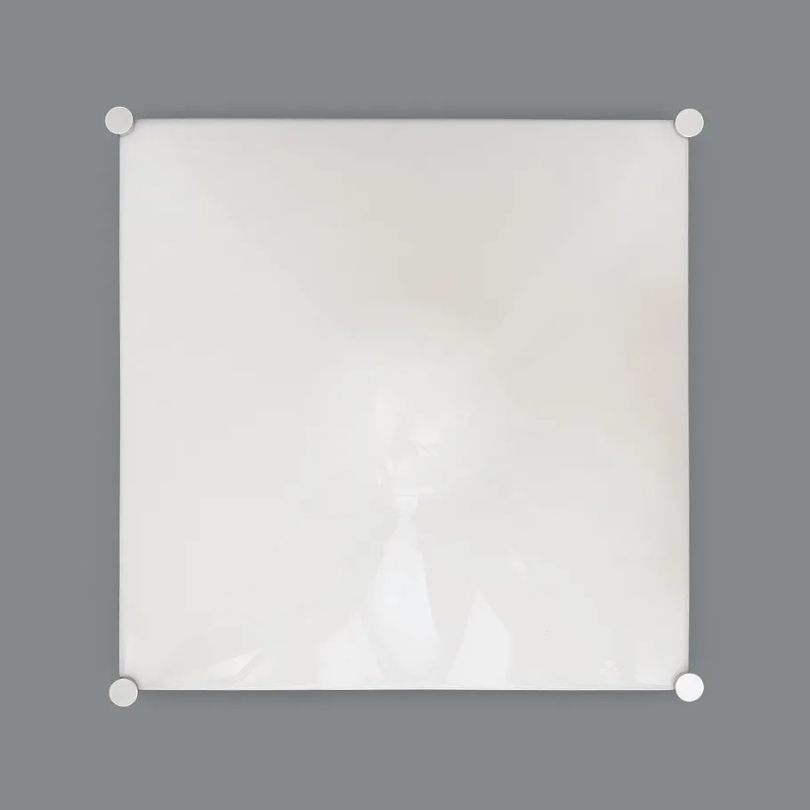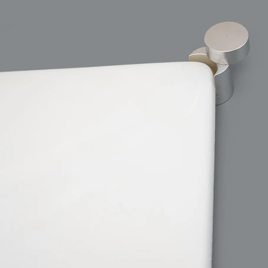 It features a white-painted metal structure, aluminium fixing pins, and a white moulded ABS diffuser with soft, geometric lines.