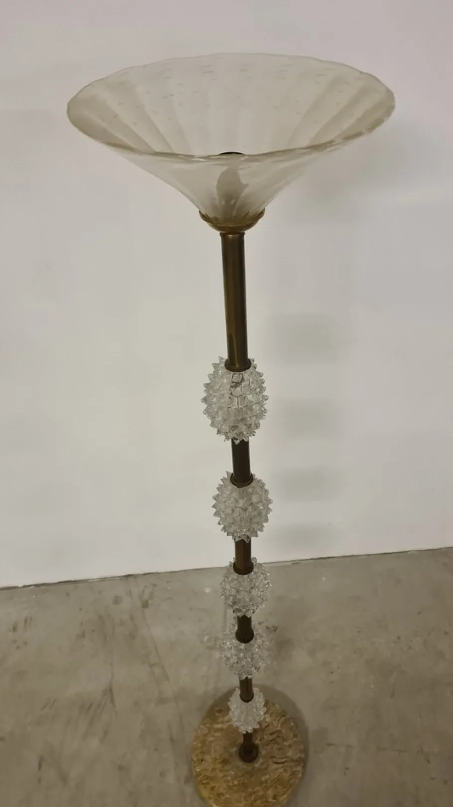Elegant floor lamp with marble base, brass and rostrated glass structure and bullicante glass lampshade.